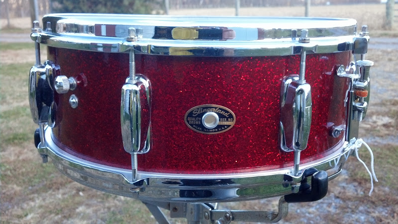 SOLD Slingerland red sparkle Hollywood Ace 3 ply wood snare drum, 14 x 5 1/2, dated Mar 65, no. 17857 $175