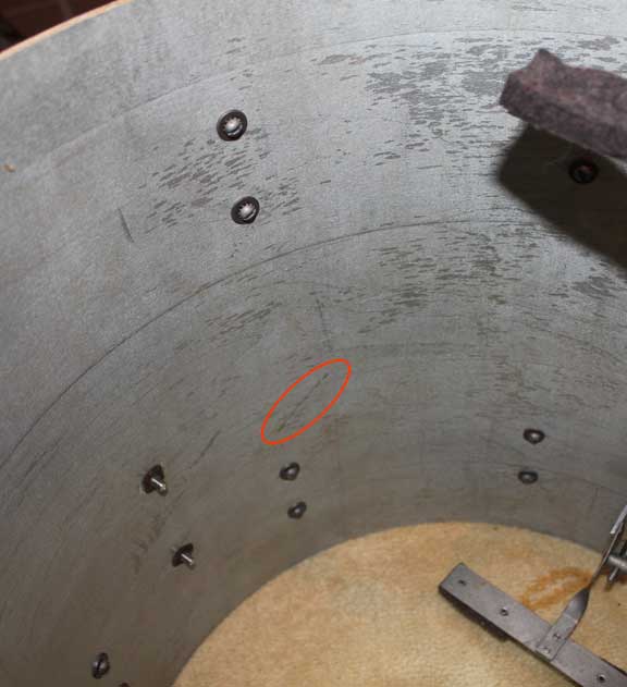 It's most likely impossible to tell from the picture, but the silver sealer on these Gretsch drums appears to have been covered with some sort of lacquer or shellac. It's thick (almost runny) in spots. The area circled in red is a paint brush bristle encased in clearcoat/sealer. No paper stickers in these drums- so I'm assuming early 60s or late 50s era. Do they all look like this? or have my drums been 'improved'?