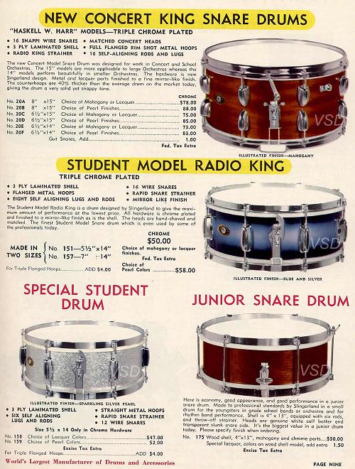 Wood Radio King snare drums are distinguished by their single ply, steam-bent maple shells, however, there were also metal shelled RKs, called the "Artists' Model", which featured 3-point strainers.