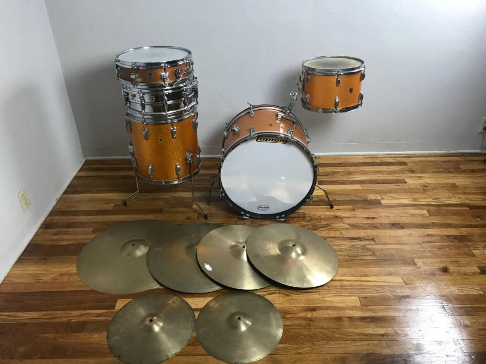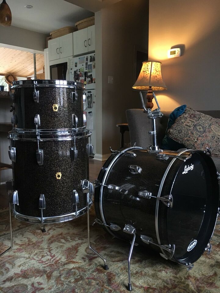 I guess it's not really an "official" Downbeat (even though it really IS)...because it's a 1967 shell pack and the DB snare is a '66...I can't remember off hand, but I THINK the configuration with the DB snare was phased out in the catalogs by then...but anyway...Here it is. And I also have a '67 Jazzette bass drum with close enough matching badge numbers that I can always swap out.