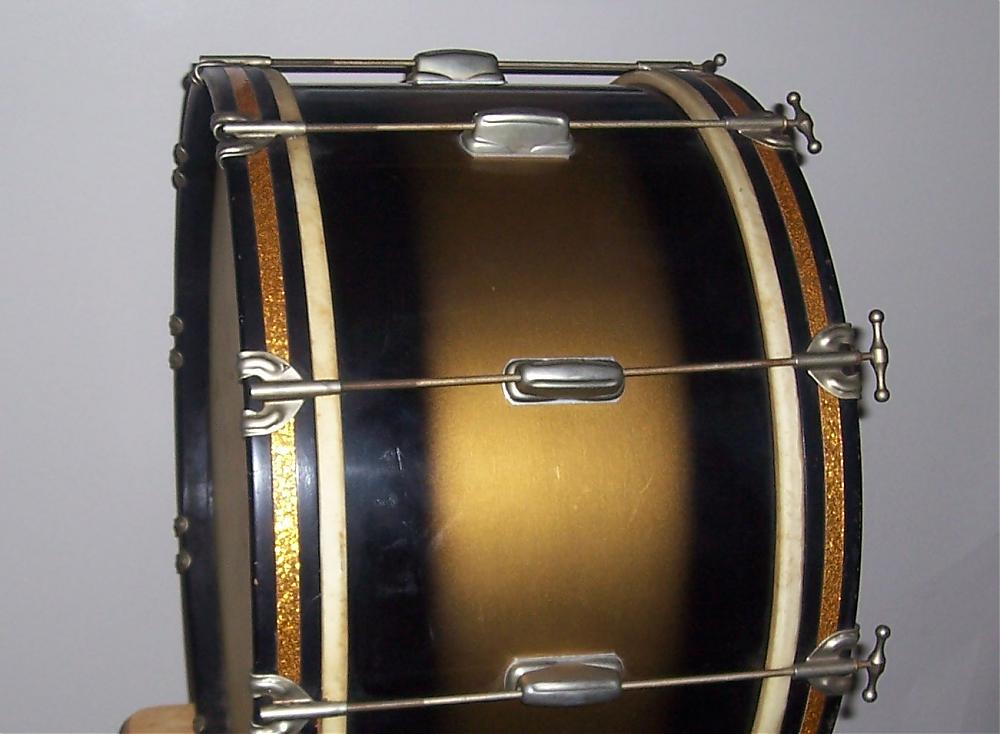 Thanks for all the feedback. I was asking because some time ago I picked up a couple of Slingy pieces in a black & gold duco finish circa 1953-1956 -- a 12x22 bass drum with a matching Student Model Radio King snare (see pics 1 & 2).
