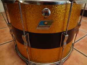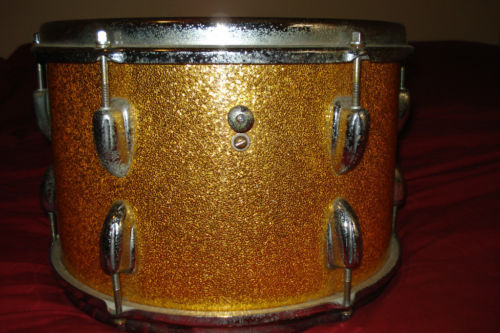 Since I figured my chances of finding the matching duco toms from the same era were slim and none I decided to look for a couple of toms with a gold sparkle wrap to match the in-lays on the bass drum hoops. I found a Slingy rack tom that's on its way (3rd pic) but the only candidate that I could find to use as a possible floor tom was a 12x15 Ludwig tenor drum (last pic). Its got a gold sparkle wrap with a black center section. I'm trying to keep costs to a minimum since the end result's going to be nothing more than a somewhat unique "player's" kit. I haven't purchased the Ludwig drum as of yet because I'm wondering if the gold sparkle wrap would actually match that on the Slingy rack tom. I'm also not sure if the Ludwig piece would be a good fit since the Slingy rack tom doesn't have the black center section.