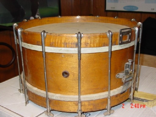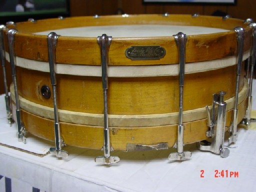 First drum is 4-1/4" x 15" wood shell - natural maple finish w/wood rims, 16 - single tension lugs, original calf skin heads, very clean condition. 1920s style Leedy Badge.