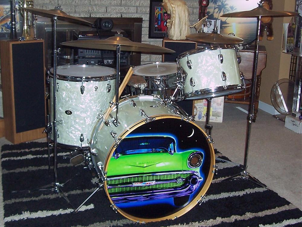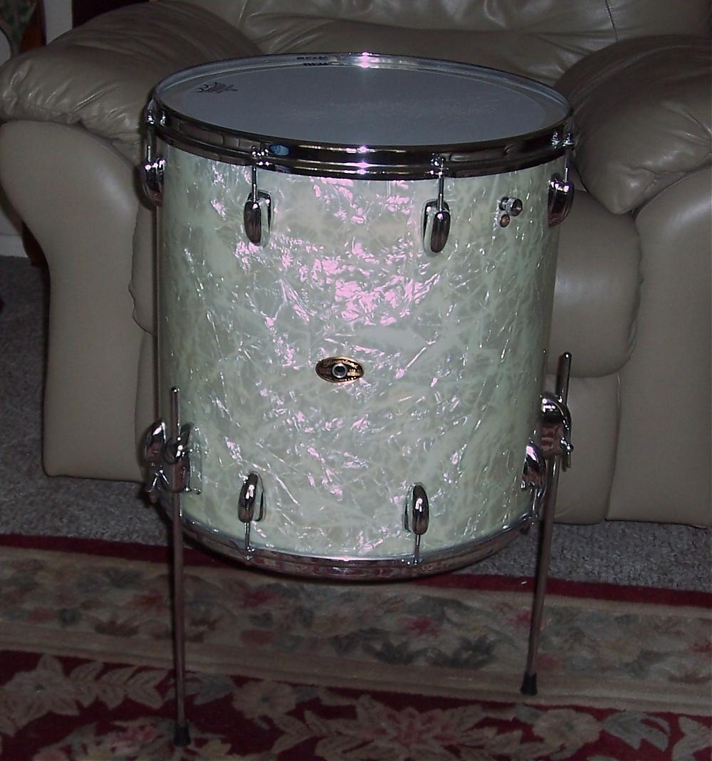 I'm trying to complete a Slingerland project on a WMP kit from 1958. Both the bass drum and rack tom I've got are from 1958. However, the floor tom that came with the kit is from the early 60s with the company's Black & Brass Niles badge (SN 165786), stick-saver rims, Slingy tone control and "straight" floor tom legs (see pics).
