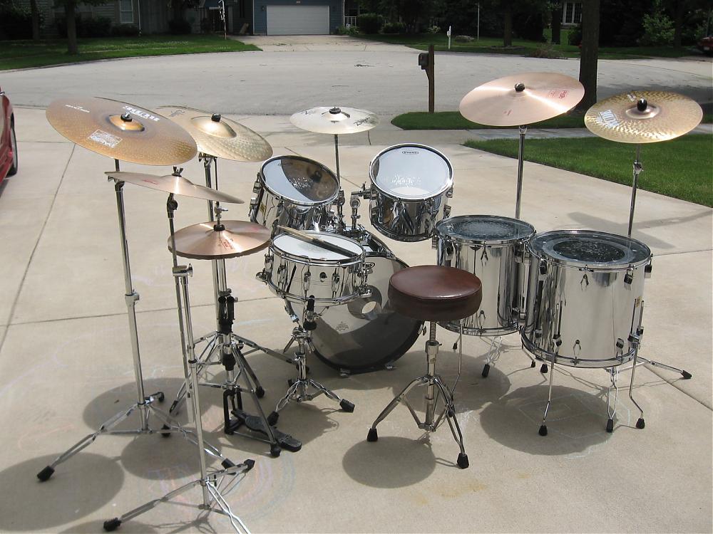 Here is my 70's Fibes fiberglass stainless steel set all polished up and ready to rock with REO this week, all tuned, and looking good, they sound like the end of the world is coming........they are in fanatasic shape..enjoy