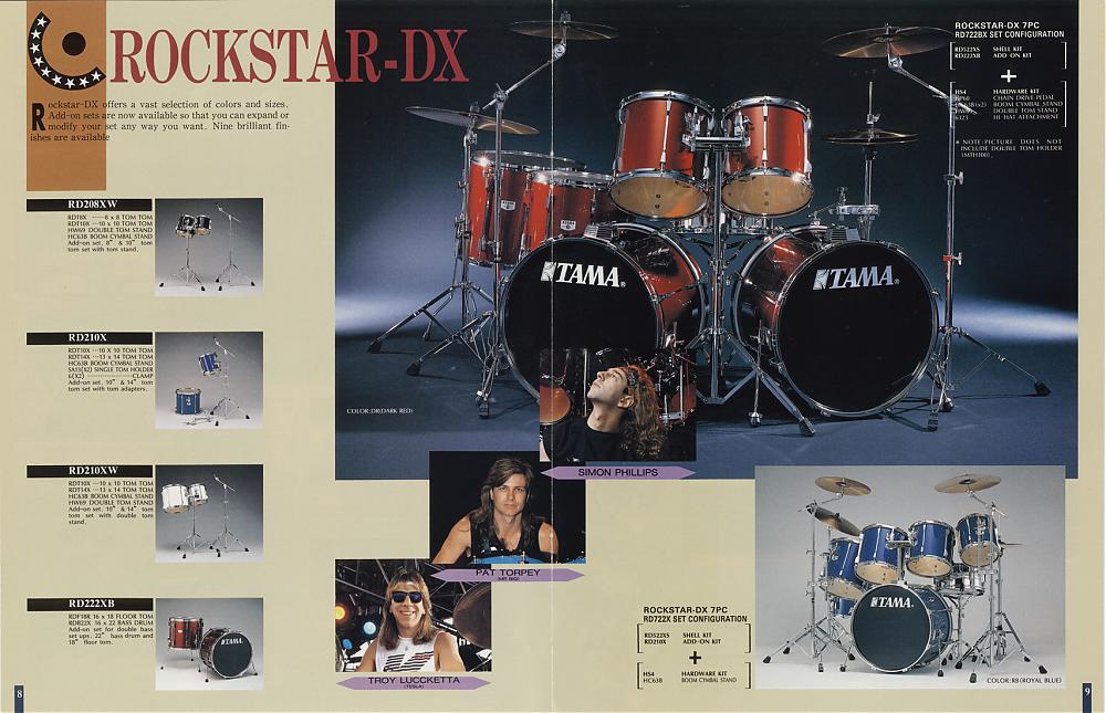 The Tama was an early to mid-90's 22/12/13/16. Royal Blue w/ COS snare and the mach lugs. See the pic below. Huge power toms. Probably 11x12 and 12x13 up top. Steel hoops on the bass drum. Aluminum colored badges with black Tama Rockstar DX on them.
