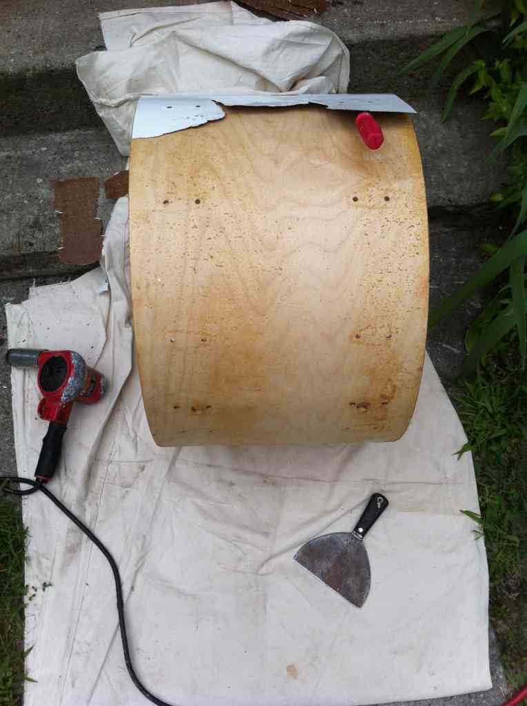 I decided to start with the 16x24 kick drum. After removing the hardware, I used an old drill bit to shave down and remove the grommet, and used a heat gun to get the badge off.