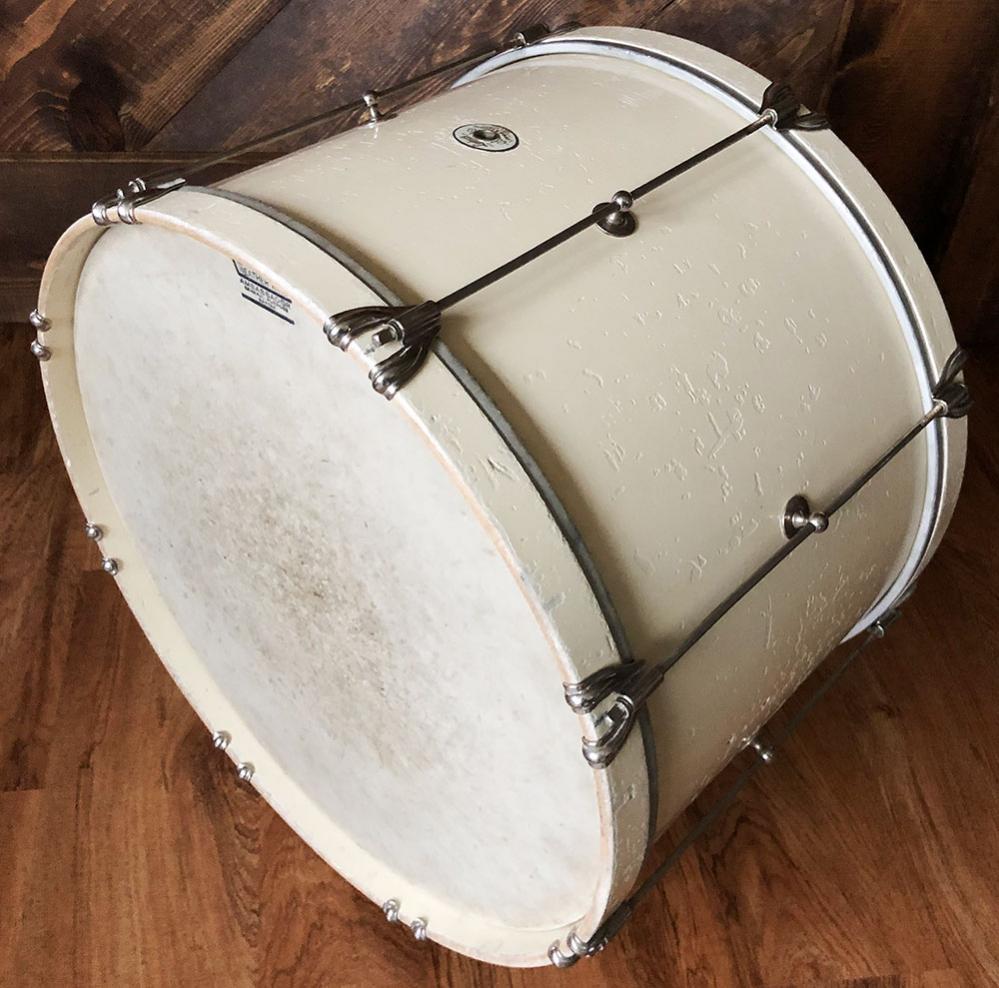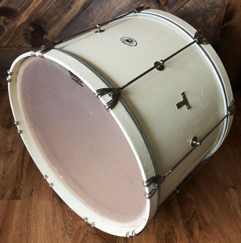 For sale is a neat Vintage 1938 Ludwig & Ludwig 12x18 Single Tension Bass Drum in great players shape. Shell is in great condition and in-round with very nice original factory edges. Two extra holes as shown from I assume a marching mount of some kind. Paint is nice but appears to have been touched up where it had flaked at some point. Nickel hardware is in good shape. Date stamp of 3812 (December of 1938) present as shown. Overall a cool bass drum in a more rare size!