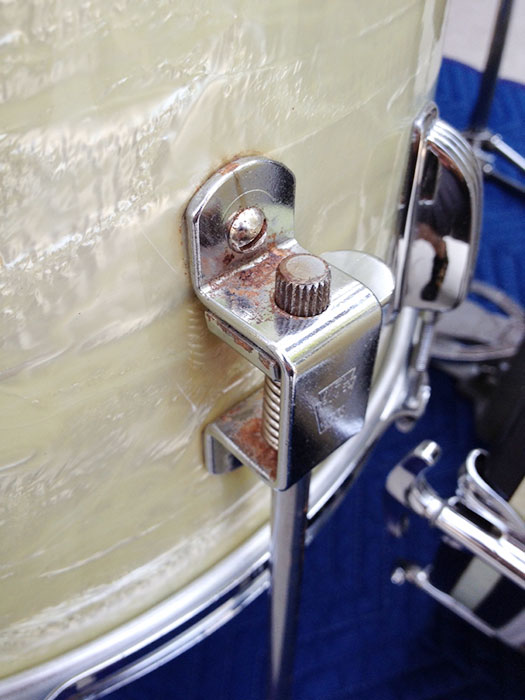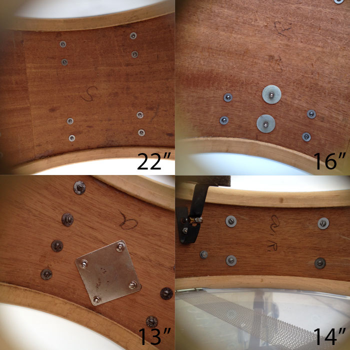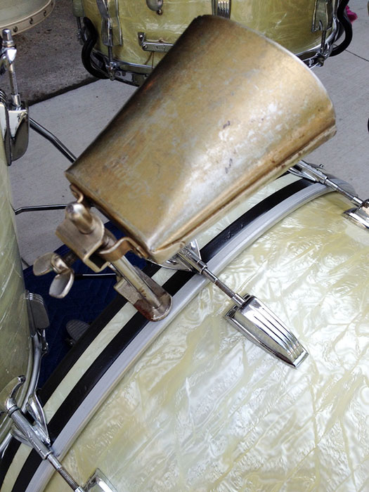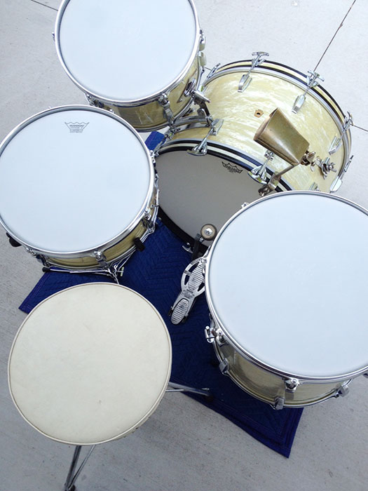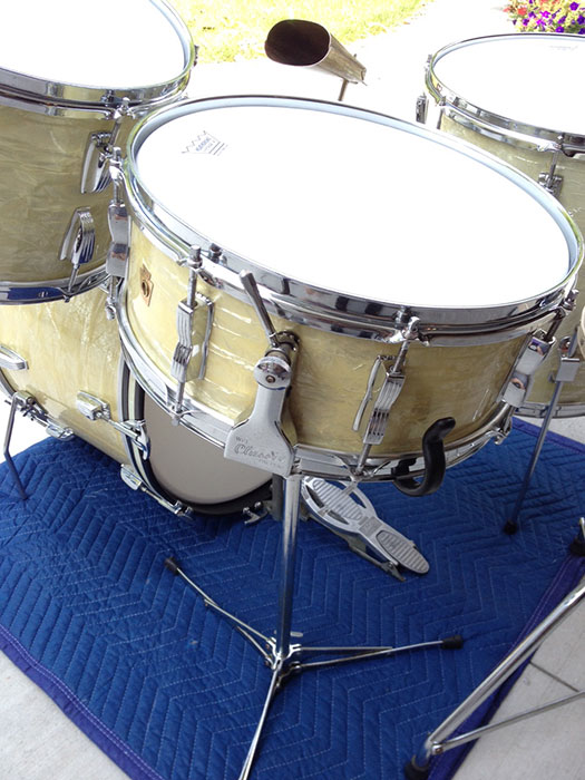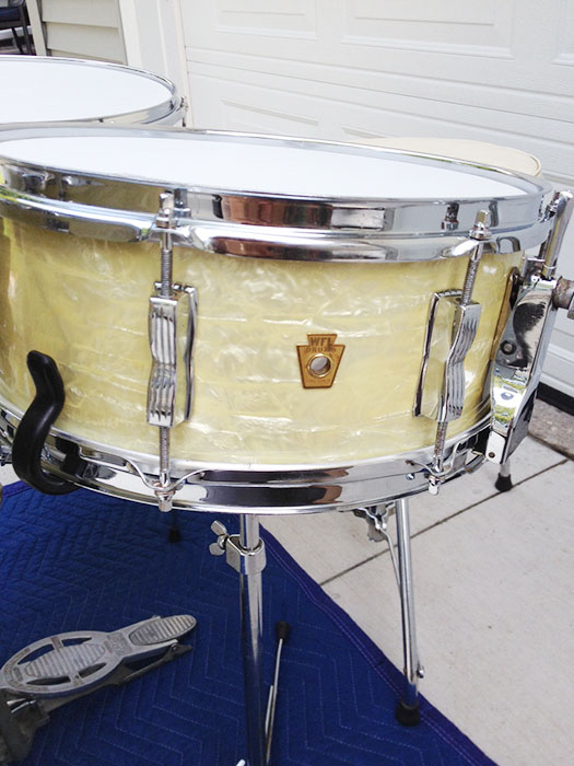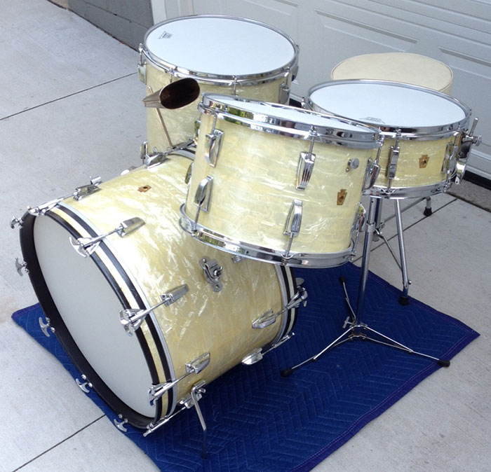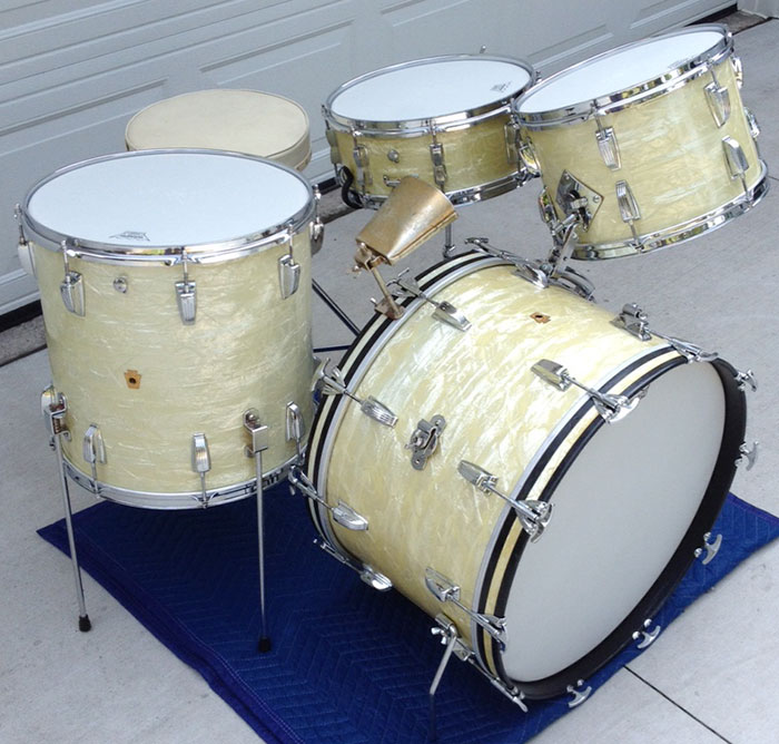 For sale is a Vintage 1950's Ludwig WFL Buddy Rich Super Classic Kit in White Marine Pearl with chrome hardware. 22/16/13 and 14 Super Classic snare. Absolutely beautiful players condition! Features keystone WFL matching badges. WMP wrap is clean, tight and slightly yellowed. Couple of chips in outside wrap edge on bass drum which is hidden by the hoop. Chrome over brass hoops. Double cymbal arm mounts. Minor scratches, oxidation and rust here and there. The worst spot is shown on the floor tom leg mount photo. Shells are in round and clean. Bearing edges look original and in good shape. Some very minor separation starting on some of the resonant side edges. Batter side bass drum hoop not original. Six of twenty total bass drum claws do not have the original "WFL" letter stamping. Brand new coated Remo Vintage Ambassadors on snare and tom batter sides, coated Remo Ambassadors on the rest. Includes snare stand, cowbell, cowbell mount, WFL Speed King bass drum pedal and throne, which I believe may be a Slingerland. Overall a very sweet looking kit!