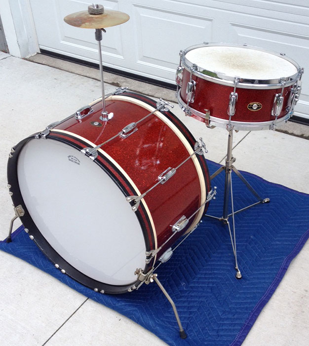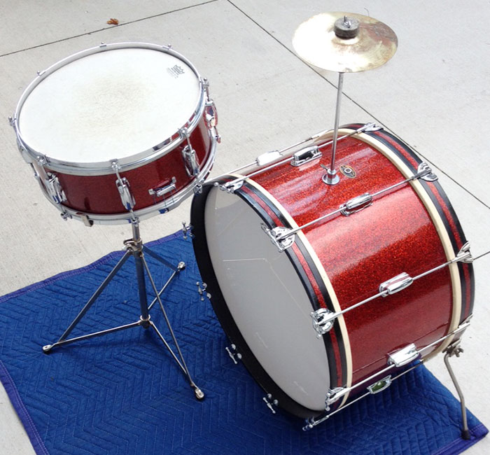 For sale is a Vintage 1950s Slingerland Red Sparkle Swingster 8-N Kit. Features the 14 snare with COB single flange hoops and a 22x12 single tension bass drum. Superb players condition. Shells, bearing edges and wrap in beautiful shape. Date stamps present but hard to make out. Minor oxidation and scratches on harware. 8 of the threaded bass drum claws appear unoriginal and could be Ludwig. New Puresound wires on snare. Includes original cymbal arm and clamp-on spurs. Throwing in a vintage Marvel snare stand and a 7" CONN cymbal from the 1920s/1930s as shown.