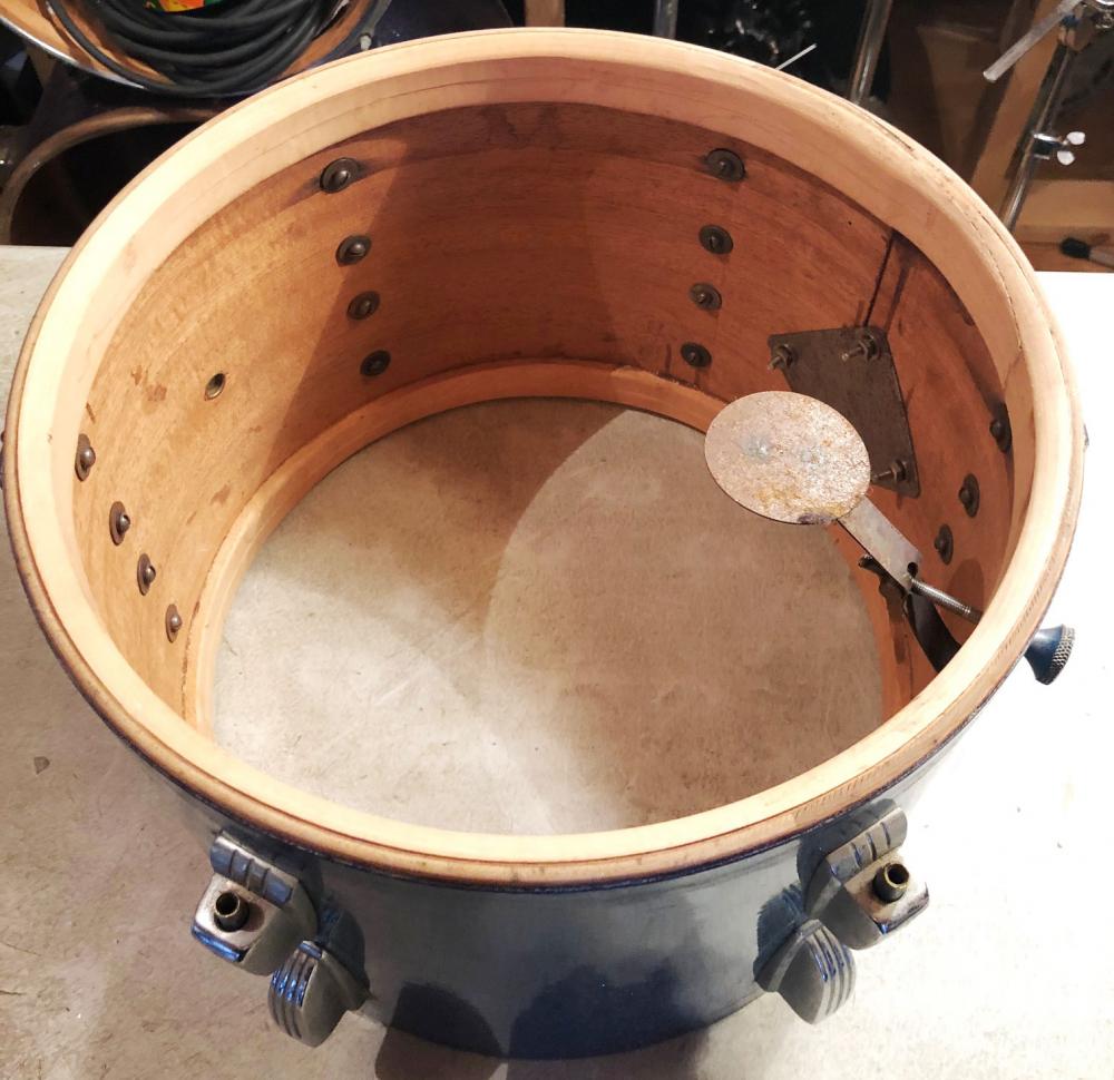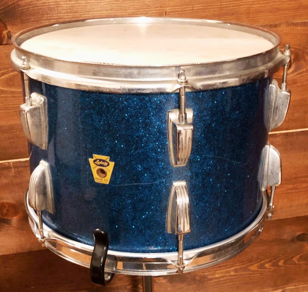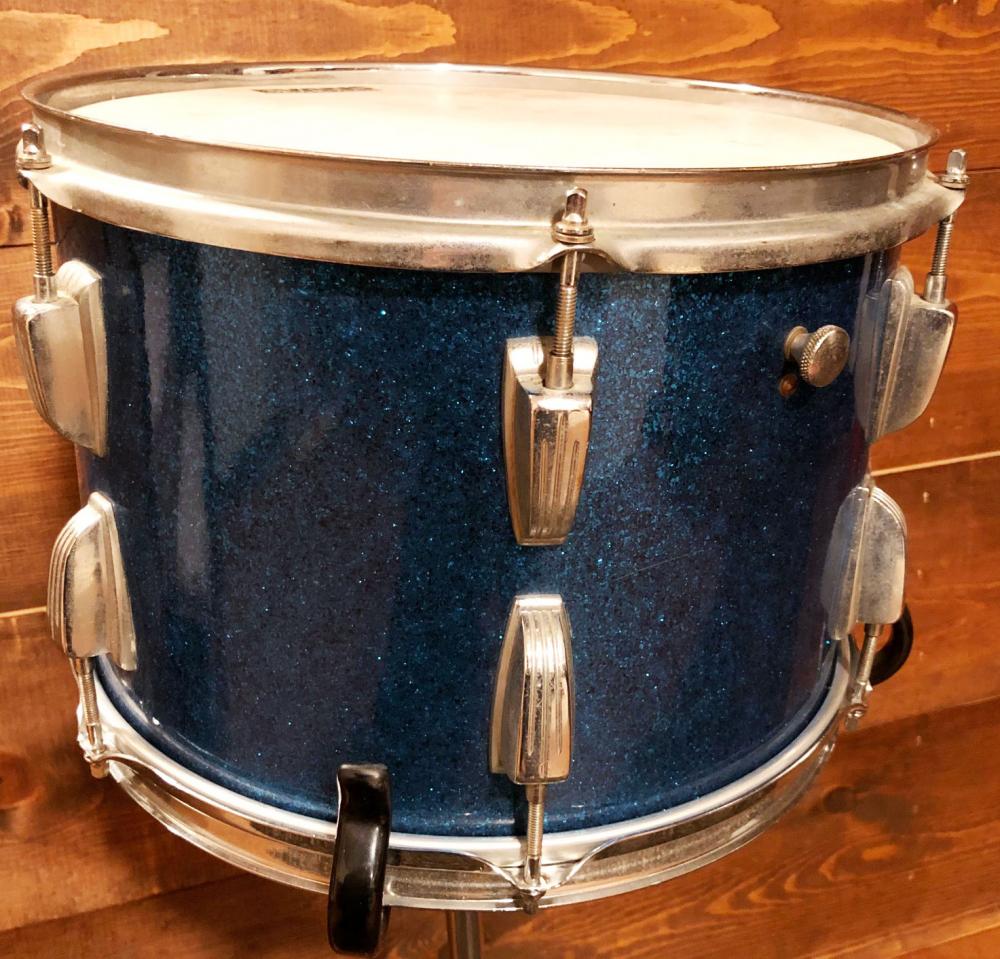 For sale is a Vintage 1959 Ludwig 9x13 Tom in Sparkling Blue Pearl in great players shape. Shell is in-round with original factory edges. No mods, issues or extra holes. Sparkling Blue Pearl wrap is tight but has some minimal fading, scuffs and scratches. Chrome hardware is in good shape. One hoop is chrome over brass, the other is chrome over steel. Features the more rare Ludwig transition badge and red date stamp of FEB 2 1959. Missing the felt on the muffler. Could use a good cleaning and detailing. Overall a beautiful 13 orphan to complete a set!