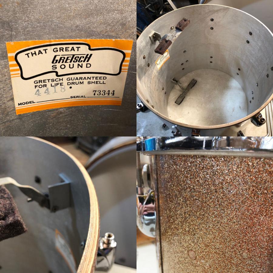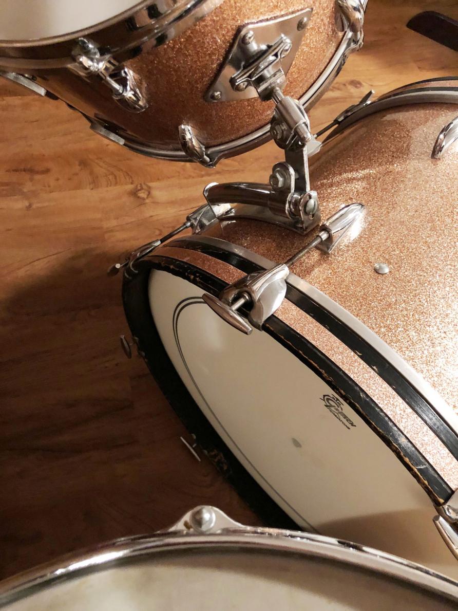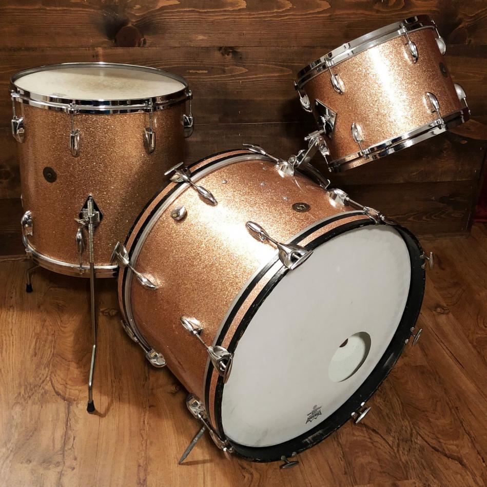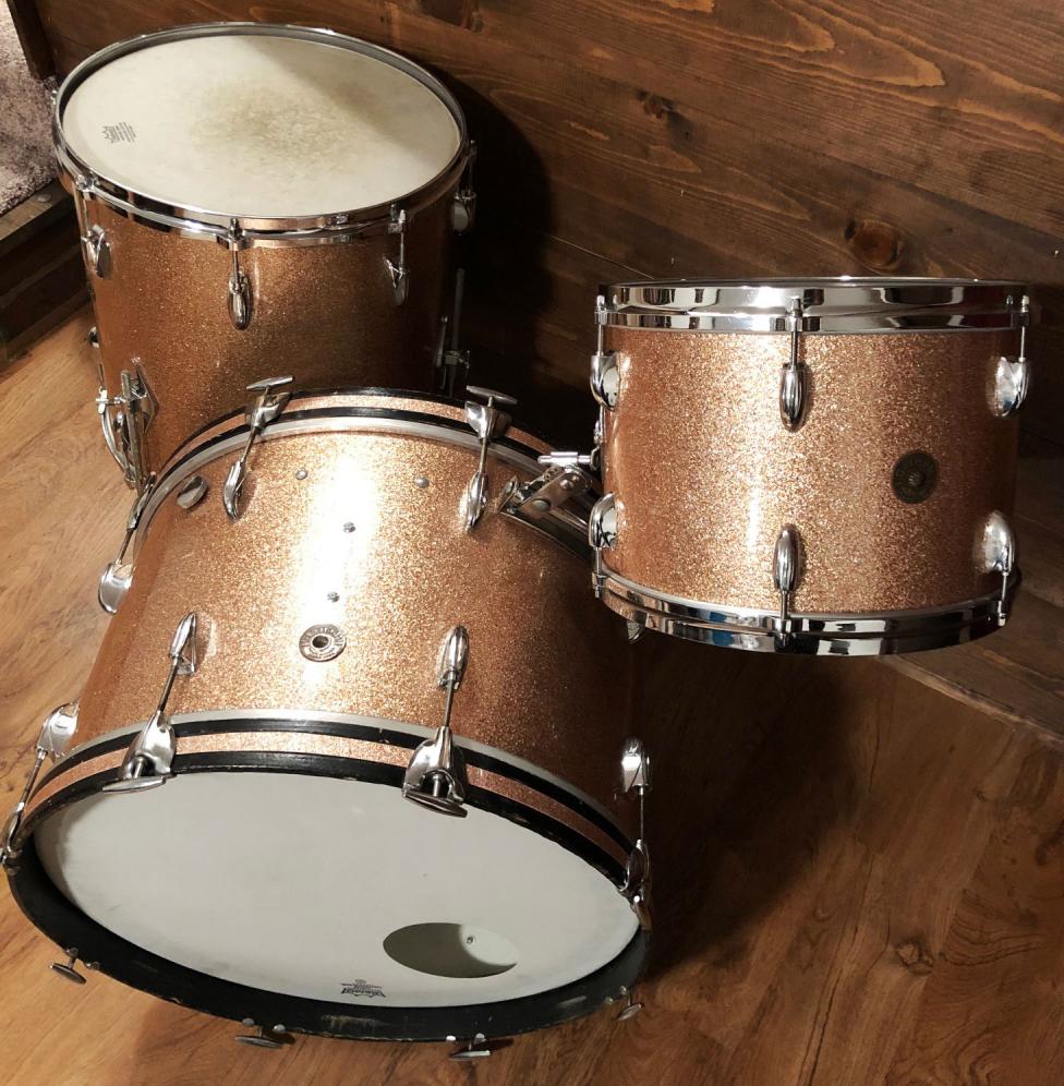 For sale is a beautiful Vintage 1960s Gretsch Round Badge 13/16/22 Drum Set in Champagne Sparkle in good players shape. Shells are in good condition and in-round with original factory edges. 22 interior was painted a blue then white at some point, with a little overspray on the edges as shown. 13 tom has a handful of interior edge chips as shown, but does not affect sound. Champagne Sparkle wrap is tight and glossy with scuffs here and there. Corner patch of wrap as shown near one bass drum seam. 16 has two extra holes that are plugged as shown. 22 has 2 extra holes from rail being moved at one point, as well as 2 additional holes from a Gretsch diamond plate mount as shown. Bass drum hoop inlays not original. Chrome hardware in decent shape with some wear in spots. Chrome over brass hoops on toms. Original paper tag present in 16 only as shown. Needs new heads - heads on 13 and 16 a slightly snug fit, heads on 22 very, very tight and will require slighty oversized heads - this is common with Gretsch drums from this era. Not a perfect kit but a great looking players kit for a great deal!