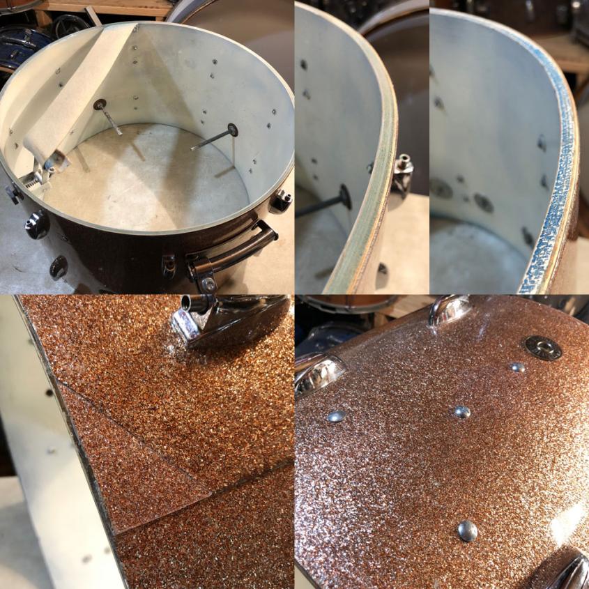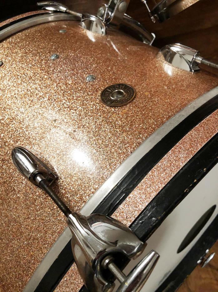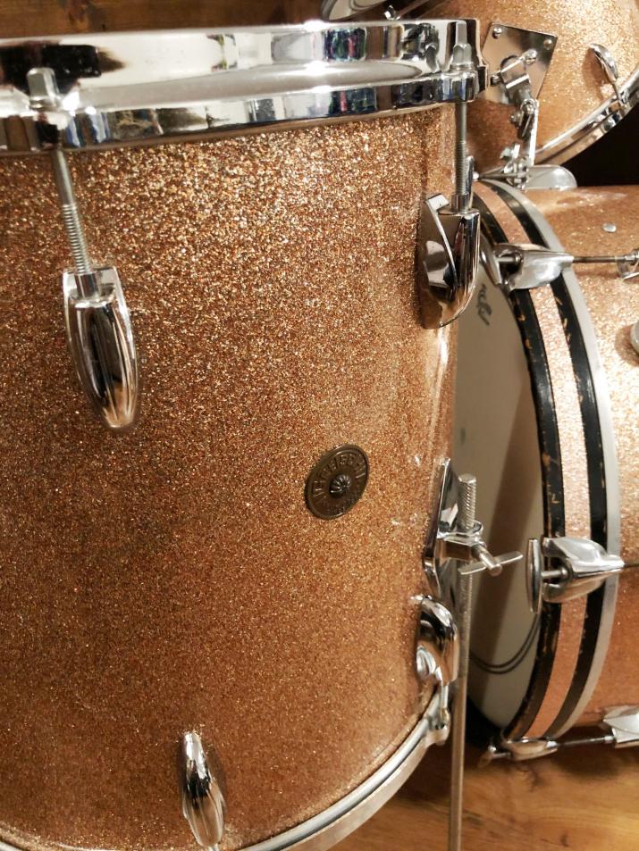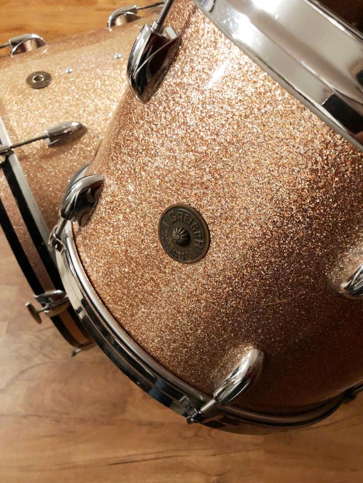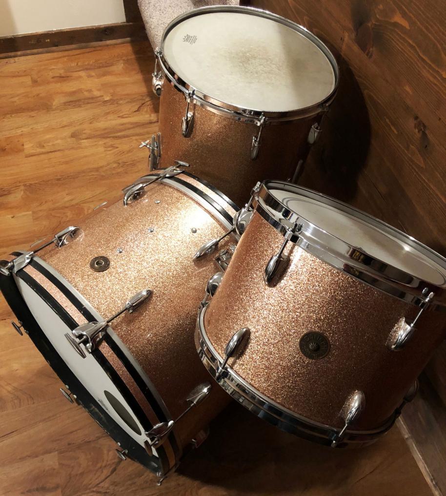For sale is a beautiful Vintage 1960s Gretsch Round Badge 13/16/22 Drum Set in Champagne Sparkle in good players shape. Shells are in good condition and in-round with original factory edges. 22 interior was painted a blue then white at some point, with a little overspray on the edges as shown. 13 tom has a handful of interior edge chips as shown, but does not affect sound. Champagne Sparkle wrap is tight and glossy with scuffs here and there. Corner patch of wrap as shown near one bass drum seam. 16 has two extra holes that are plugged as shown. 22 has 2 extra holes from rail being moved at one point, as well as 2 additional holes from a Gretsch diamond plate mount as shown. Bass drum hoop inlays not original. Chrome hardware in decent shape with some wear in spots. Chrome over brass hoops on toms. Original paper tag present in 16 only as shown. Needs new heads - heads on 13 and 16 a slightly snug fit, heads on 22 very, very tight and will require slighty oversized heads - this is common with Gretsch drums from this era. Not a perfect kit but a great looking players kit for a great deal!