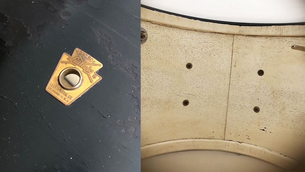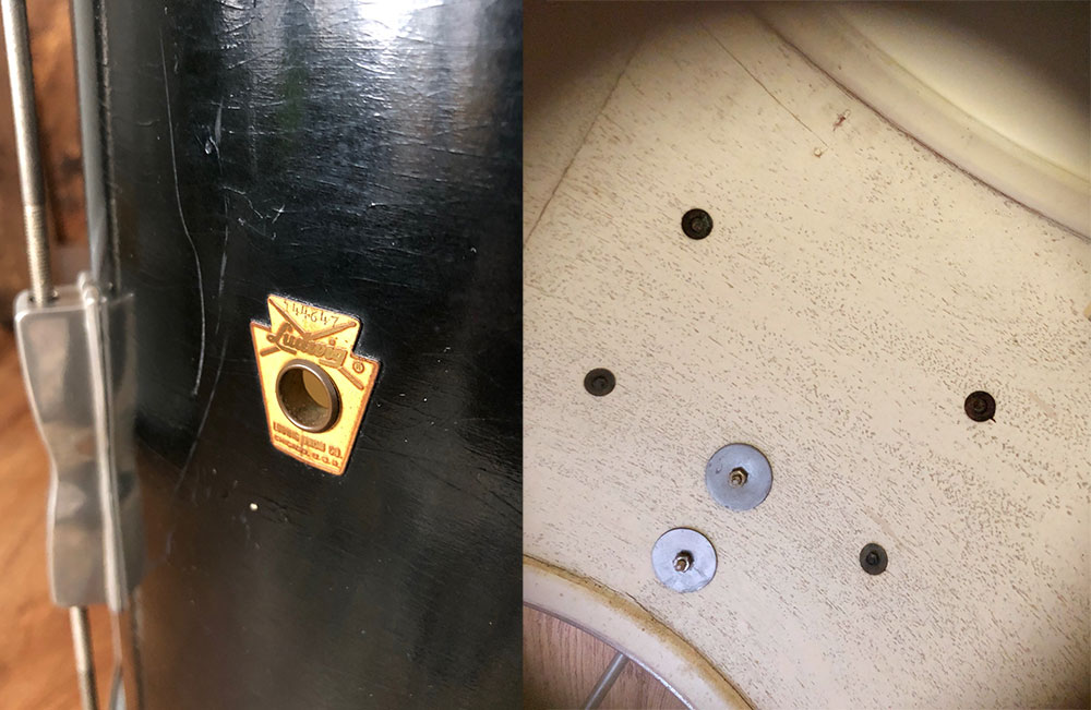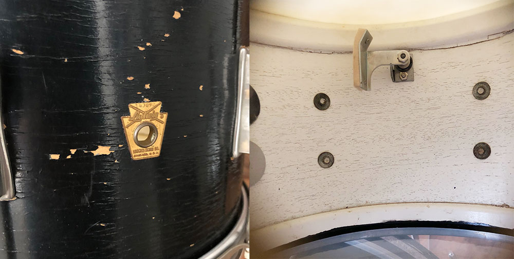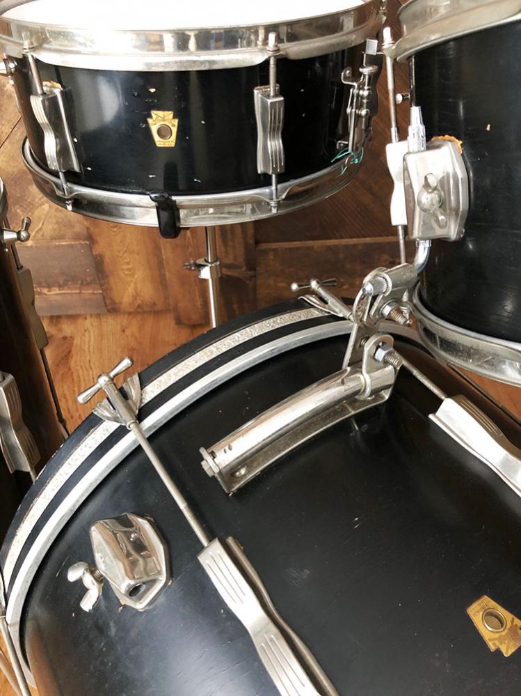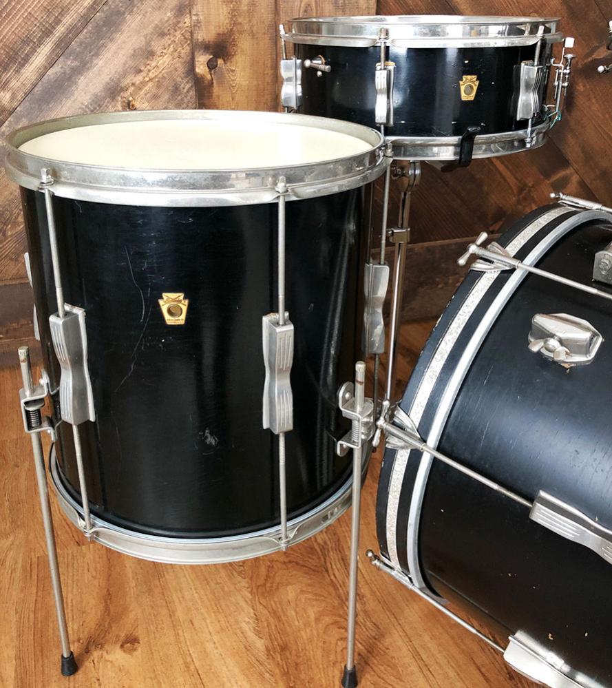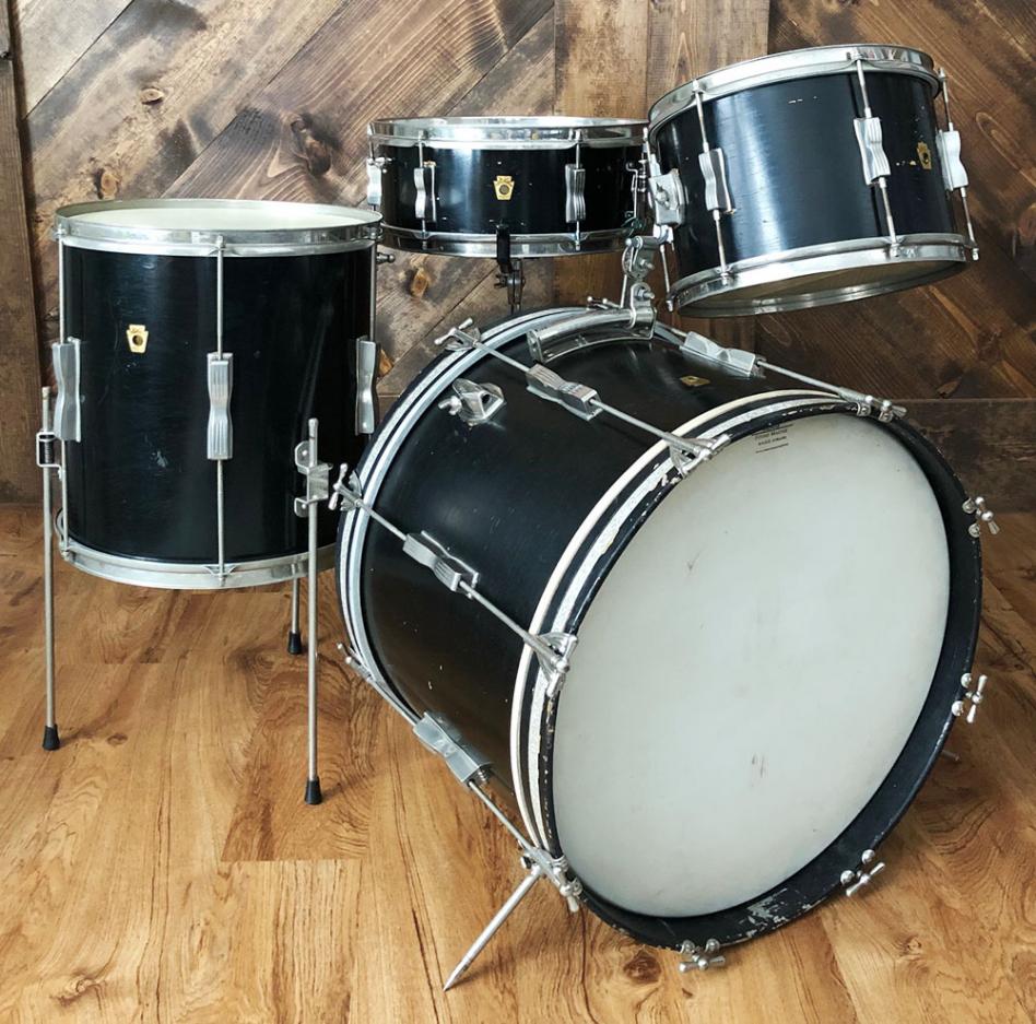 For sale is a classy Vintage 1960s Ludwig Club Date Drum Set in Black Lacquer in decent players shape. 12, 14, 20 sizes with 14 pioneer snare. Shells are in good condition and in-round with original factory edges. Black lacquer finish is decent but is very spidered, flaking and looks to have paint touch-ups. Bottom edge of 12 and resonant side of 20 have been painted black. Bass drum appears to have 2 plugged holes near badge from different rail location. Original white interior paint with apparent touch-ups. Nickel hardware is oxidized but in good shape. Nickel over brass hoops. Batter side bass hoop is a little warped but functional. New silver glass glitter inlays on both bass drum hoops. Nickel bass drum rail looks to be a vintage Gretsch with chrome L arm for mounted tom. Bass drum cymbal arm mount appears post-factory. Only date stamp found is in floor tom which is very faded or painted over and appears to read APR 13 1965. Keystone badge serial numbers are as follows: 14 pioneer snare 122710, 12 mounted tom 143892, 14 floor tom 144647 and 20 bass drum 141506. Could use new heads of your choice. Snare stand shown not included. Just a wonderful players kit with tons of class and tone!
