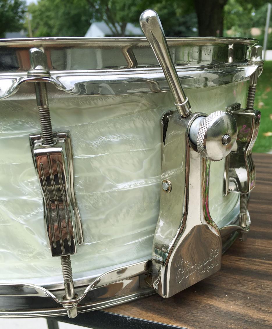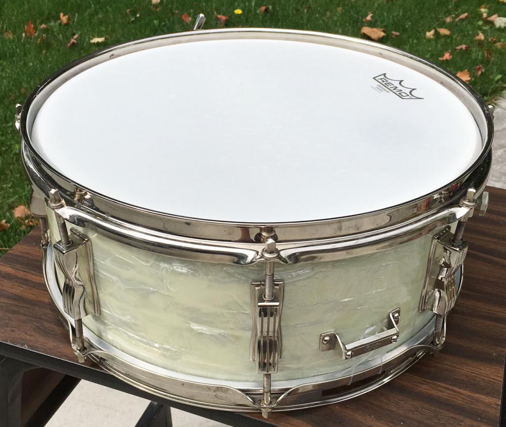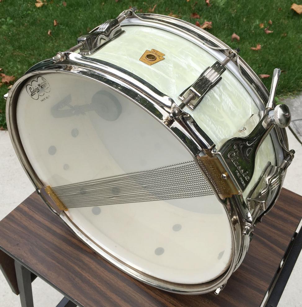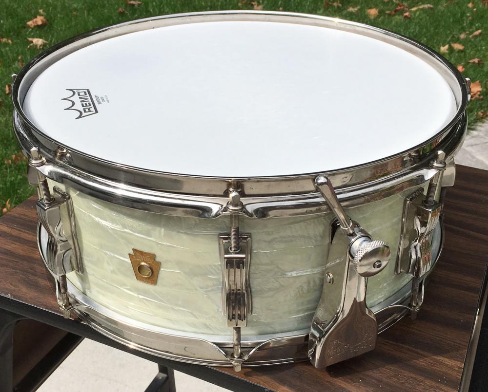 For sale is a gorgeous Vintage 1961 Ludwig Pre-Serial Super Classic 5.5x14 Snare in White Marine Pearl. Excellent players grade. Wrap is slightly yellowed, but evenly faded, tight and glossy. Nickel hardware plus Nickel Over Brass hoops with some wear and minor oxidation. Shell is in-round with very nice shape original bearing edges and vivid original interior paint. Red date stamp of JUN 13 1961 present. Original classic strainer throw functions perfectly. Features pre-serial keystone badge. Just an overall classic, eye-catching drum that tunes up great and sounds superb!
