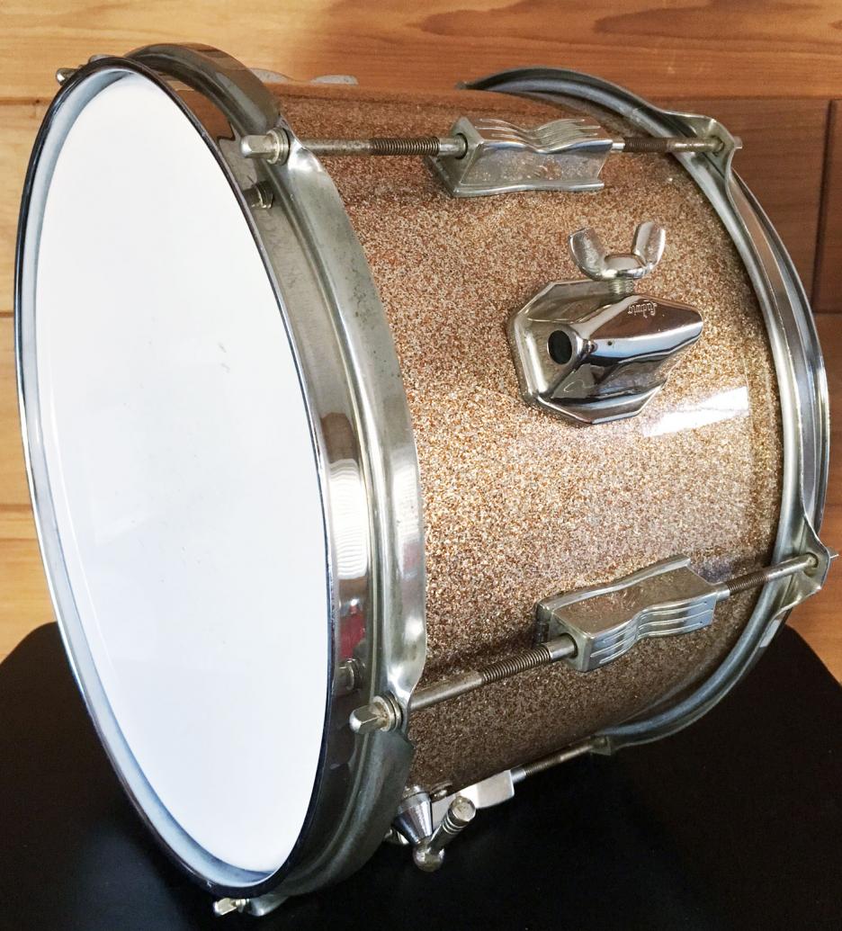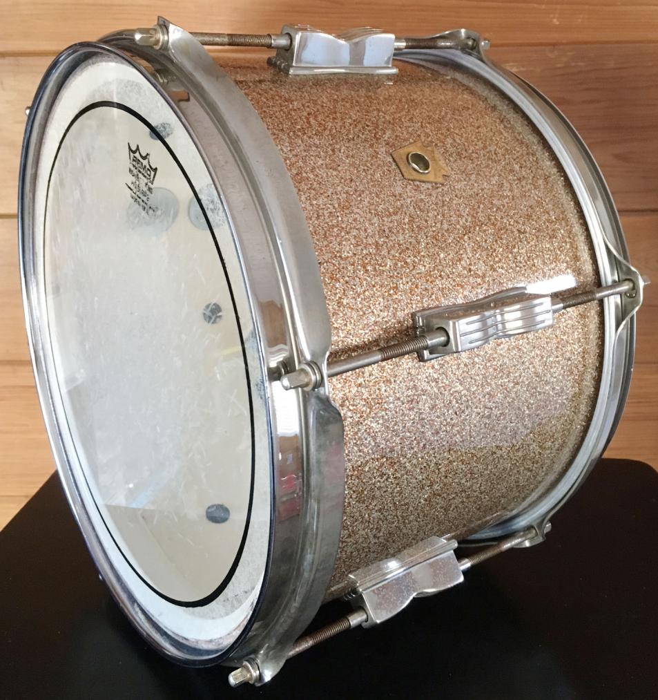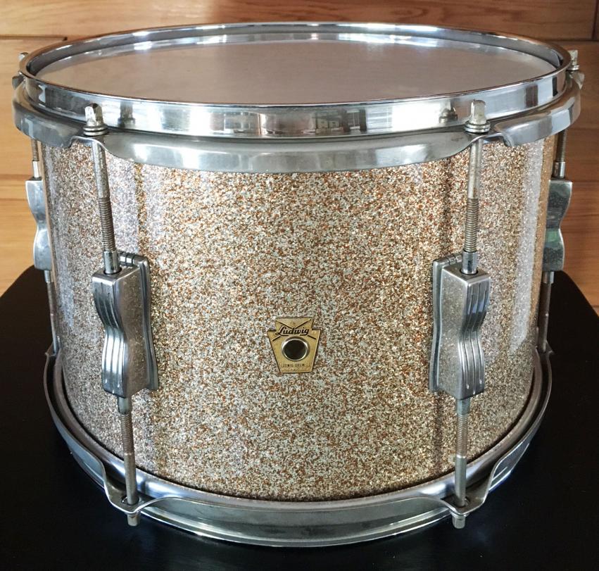 For sale is a nice Vintage 1965 Ludwig 12″ Club Date Tom in Champagne Sparkle in great players shape. Shell is in-round and in nice shape with original bearing edges and clean interior paint. Wrap is tight, glossy and has only minor fade. Nickel hardware has minor oxidation. Nickel over brass hoops. Bottom hoop has small crack starting and is a little bent. No date stamp present. Keystone badge with serial number 291665. A sweet looking and sounding drum in a beautiful classic finish!