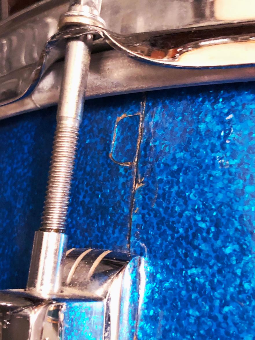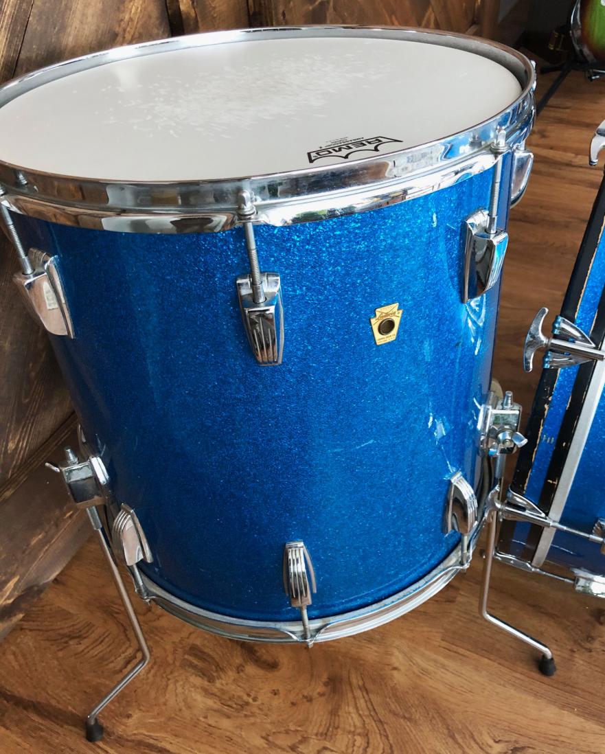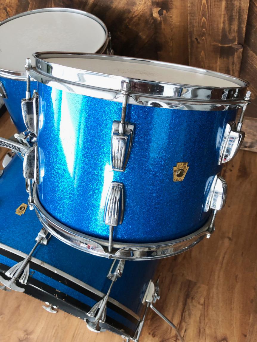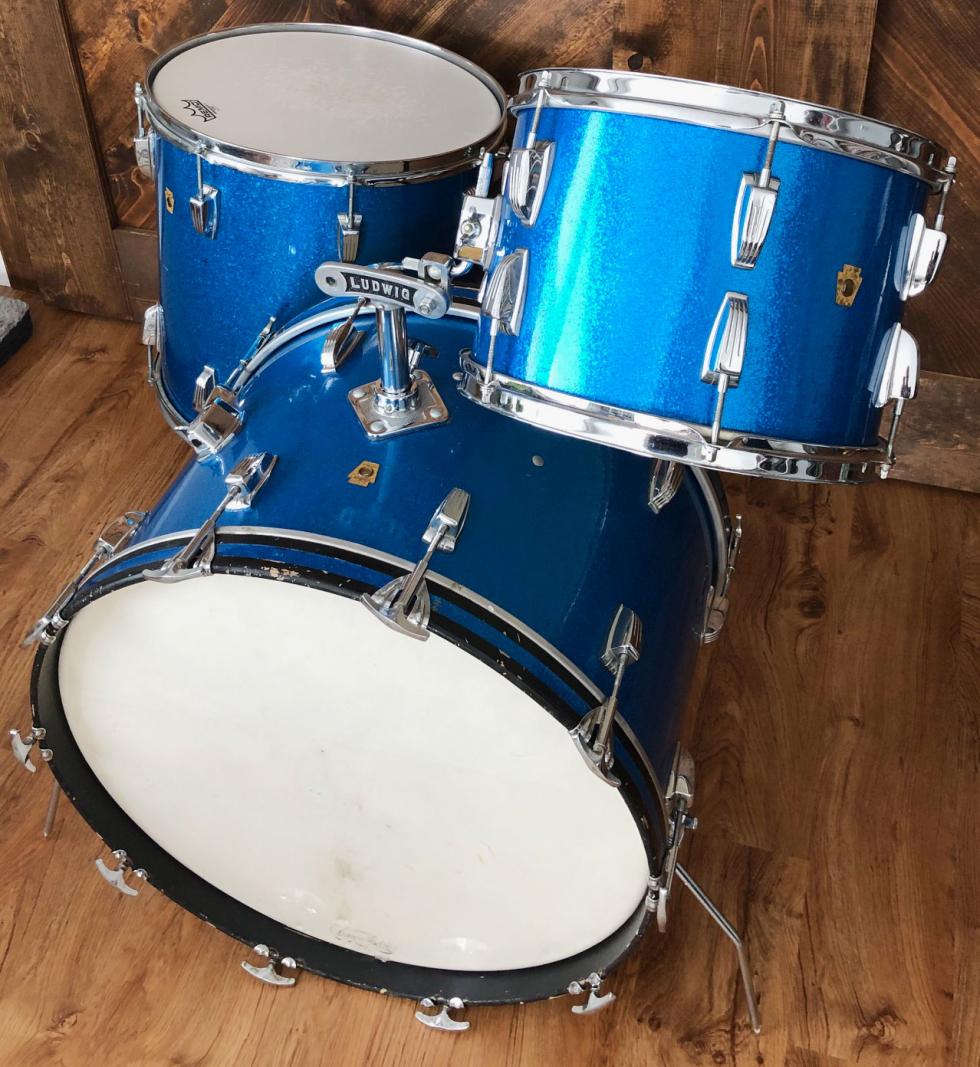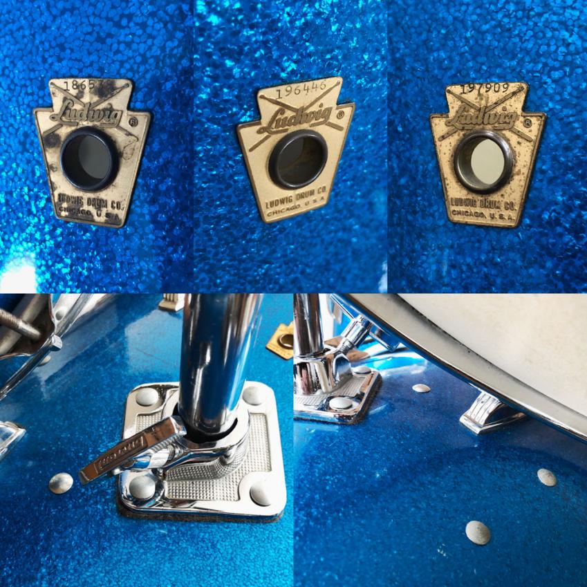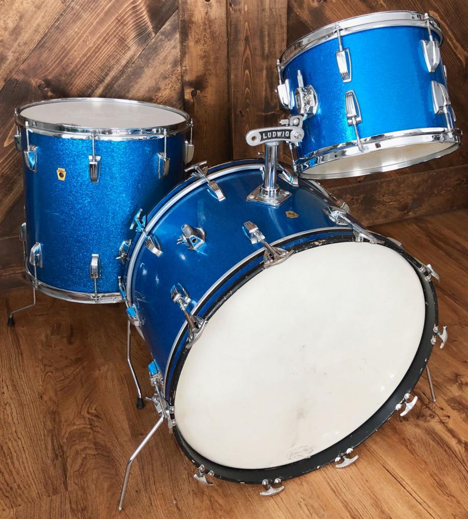 For sale is a nice Vintage 1965 Ludwig Super Classic 13/16/22 Drum Set in Blue Sparkle in great players shape. Shells are in excellent condition and in-round with nice original factory edges and original white interiors. Blue sparkle wrap is tight and glossy with some wear. Floor tom has small patch repair at seam as shown. Chrome hardware in good shape with some wear and oxidation in spots. Chrome over brass hoops on floor tom, chrome over steel hoops on 13 tom. Bass drum has post-factory post mount installed that uses one of the original rail mount holes as shown. Bass drum date stamped AUG - 9 1965 with keystone badge serial 197909. Floor tom date stamped AUG - 9 1965 with keystone badge serial 196446. 13 tom date stamped AUG - 5 1965 with keystone badge serial 186539. Just a great players kit with that awesome sixties Ludwig tone!