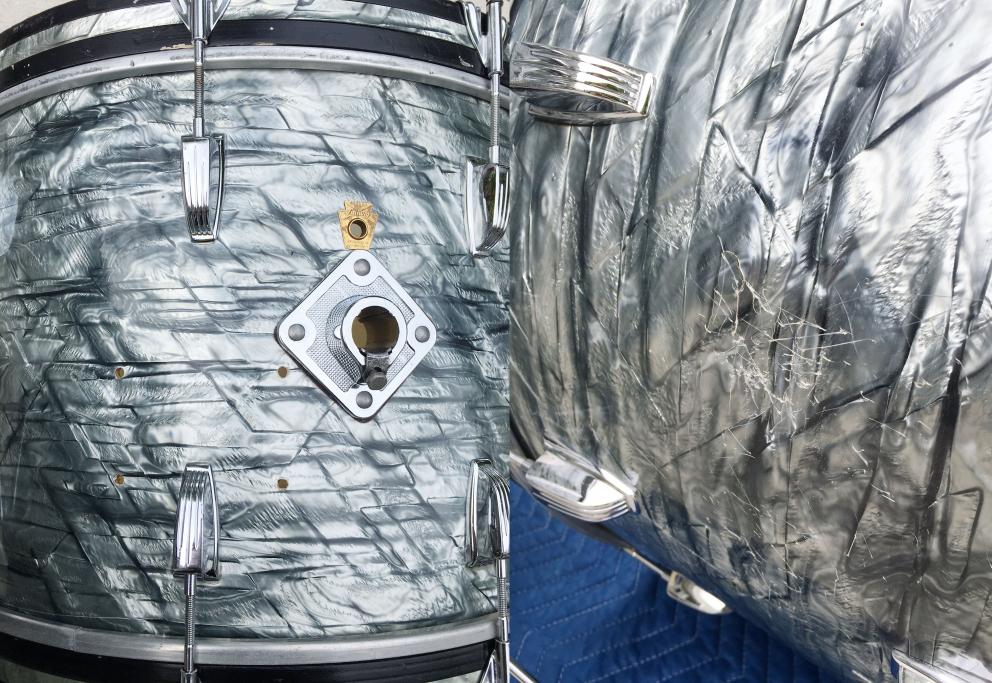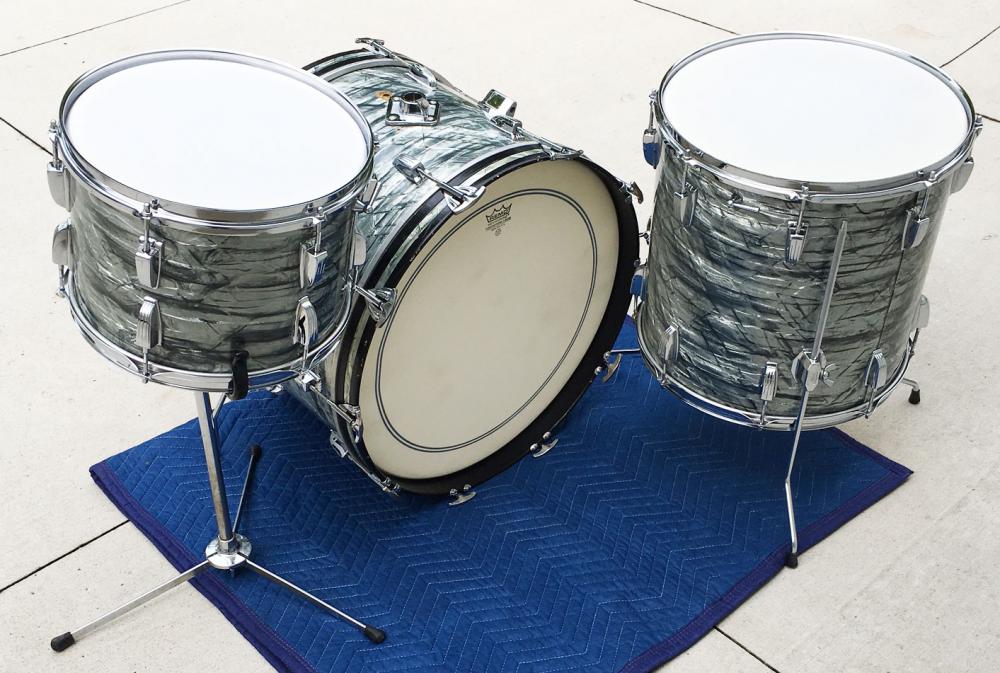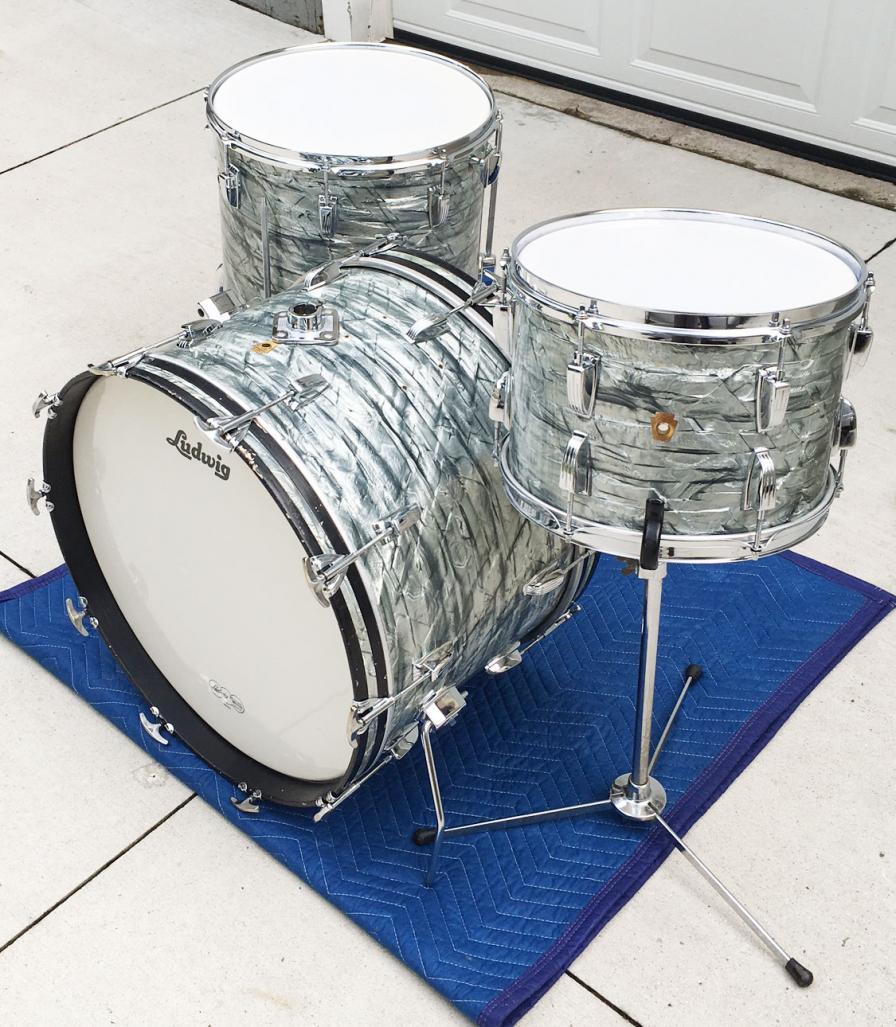 For sale is a nice Vintage 1966 Ludwig Classic 22/16/13 Set in Sky Blue Pearl in great players shape. Freshly detailed. Wrap is tight with very minor seam lift and has a some fade. Wear and scuffs here and there in wrap with one area on the right side of the bass drum which is heavily scratched or cracked shown in photos. Shells are in-round and have the original interior paint which has some flaking, especially in the 13. Bearing edges are original and in great shape on the batter sides. Resonant side bearing edges a little more worn in areas (most likely from having the hoops off over time) and one tiny slice in the 16 resonant edge. Chrome is pitted and scratched in areas, but still gleams. Post-factory bass drum post mount added somewhere along the way, but the four original rail consolette holes are still present. Keystone badge serials and black date stamps as follows: 13 serial 401459 with date stamp of SEP 26 1966, 16 serial 403505 with date stamp of SEP 26 1966, 22 serial 403103 with date stamp SEP 27 XXXX (smudged and not readable, but I'm assuming 1966). Snare stand shown is included. Could use some new heads and it would be ready to go to the gig! Just a great players kit that looks and sounds superb!