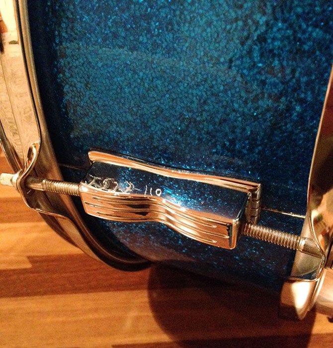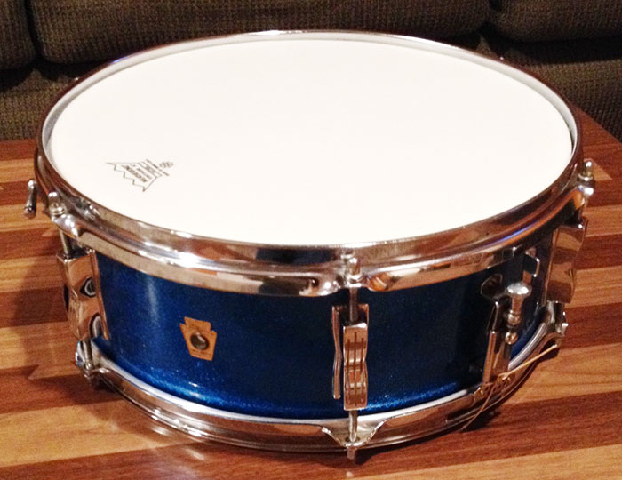 For sale is a super clean Vintage 1966 Ludwig Pioneer Snare in Blue Sparkle with chrome hardware. Tunes and plays great. Top hoop is chrome over steel, bottom hoop is chrome over brass. Shell is in-round and has clean original bearing edges. Wrap is tight and clean. Original painted white interior with MAY 10 1966 date stamp. Serial number is 258607. New Puresound wires and Remo heads. Lug on wrap seam has a little engraving on it. Otherwise a very, very clean Pioneer.
