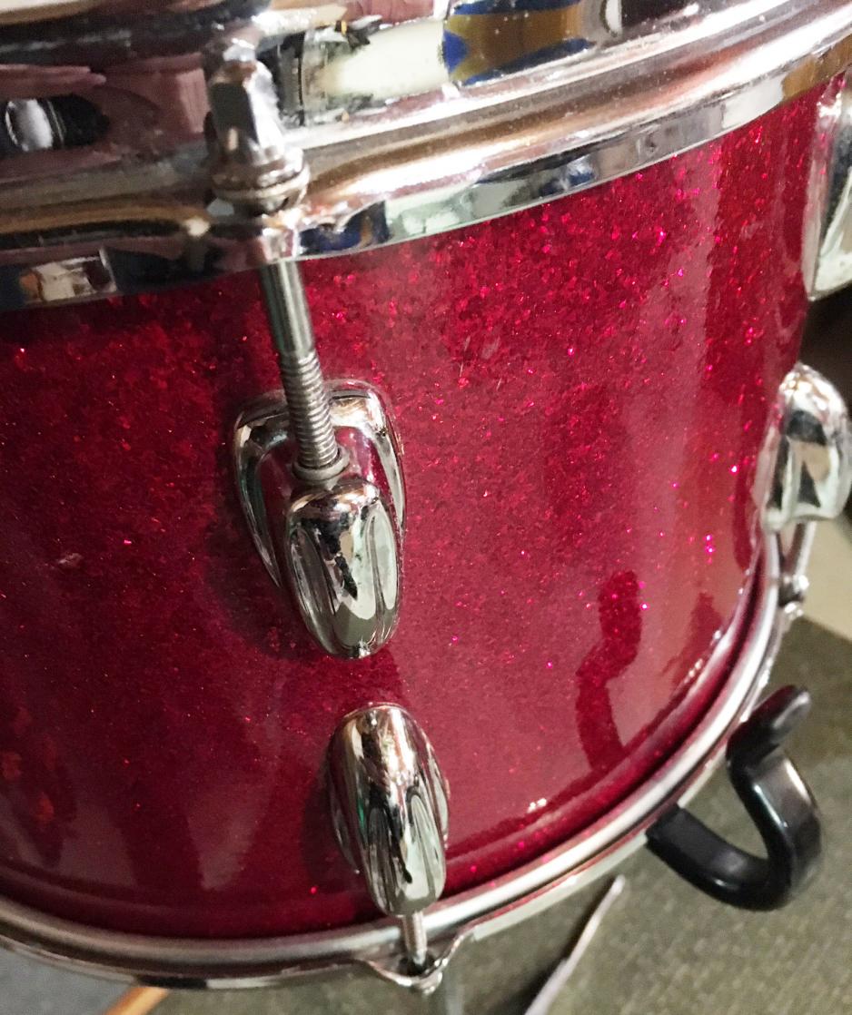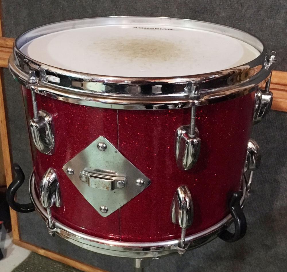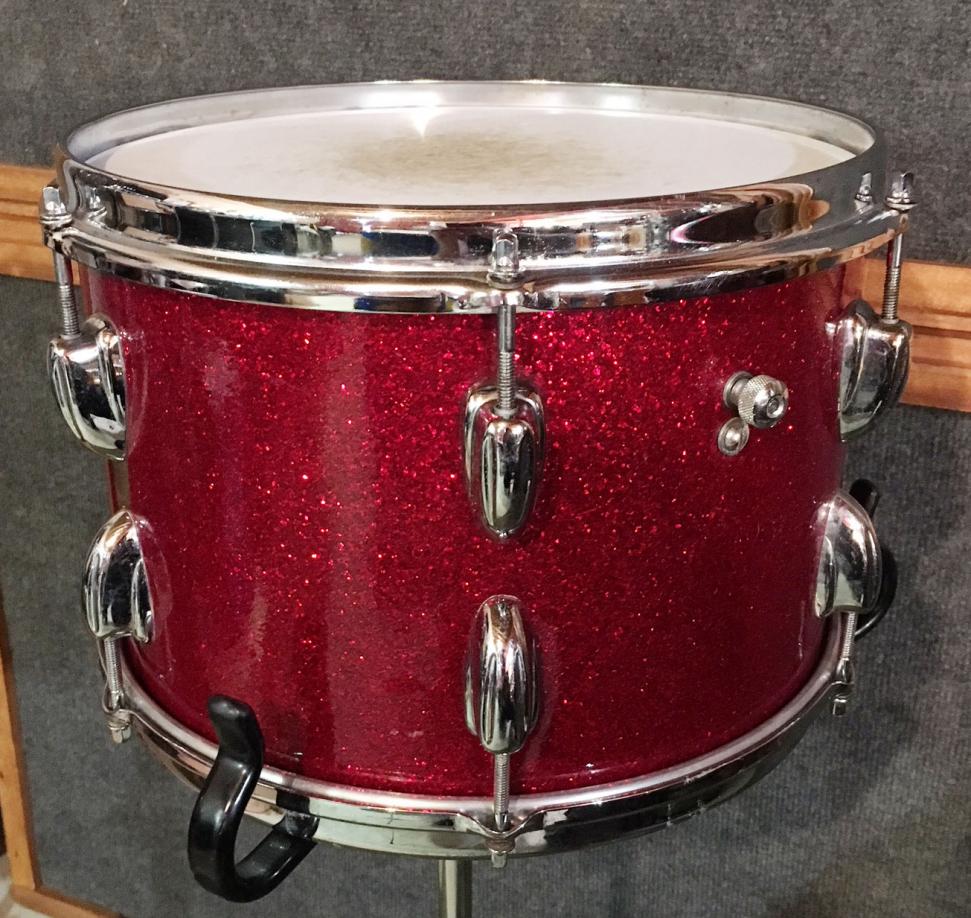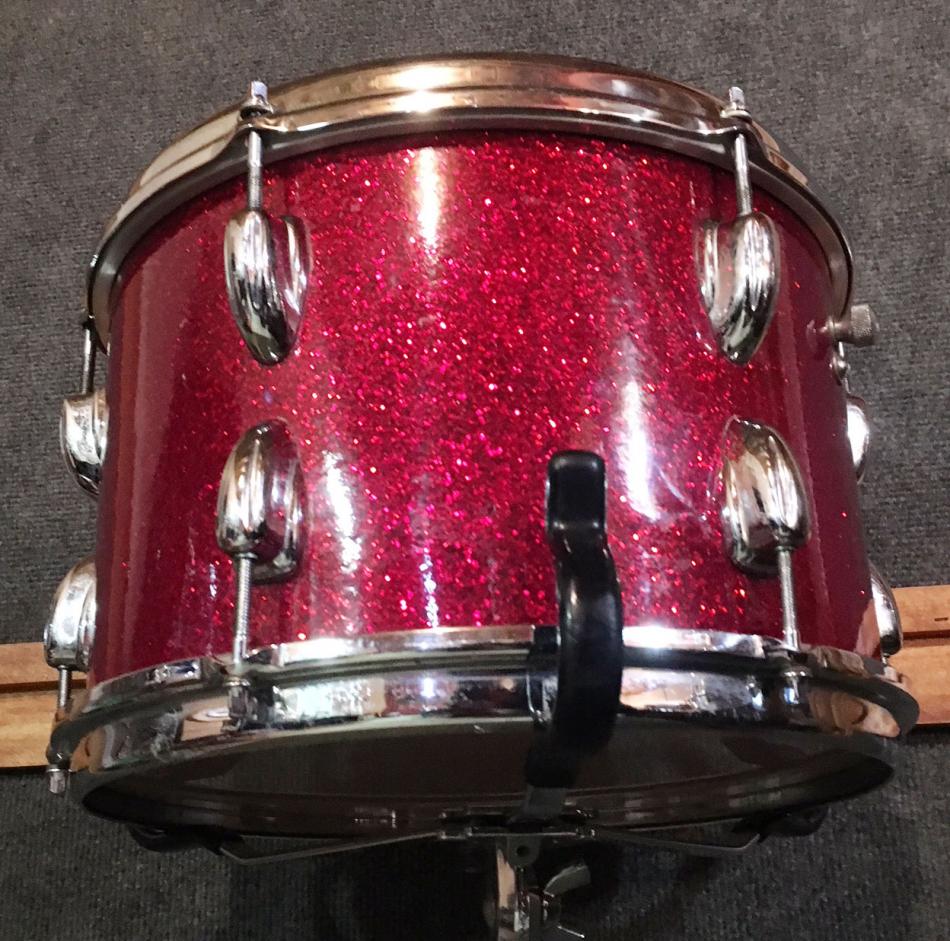 For sale is a Vintage 1966 Slingerland 12" Tom in Red Glass Glitter in great players shape. Shell is in-round with decent original bearing edges and clear maple interior. FEB X 1966 datestamp present. Chrome hardware has some oxidation, pitting and wear. Wrap has minimal fade and is tight and glossy with some scuffs. Seams are nice and tight. One chrome over brass hoop, one chrome over steel hoop. No badge as this is from the badgeless era. Overall a nice tom!