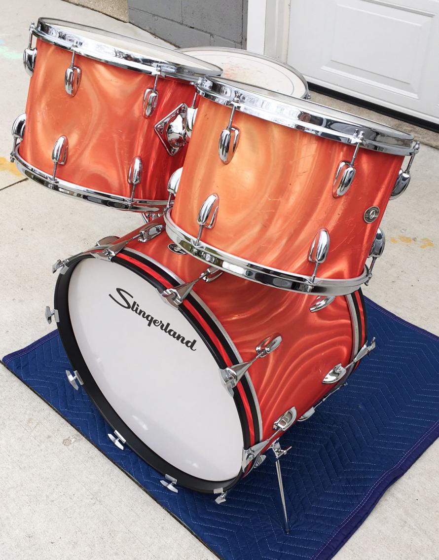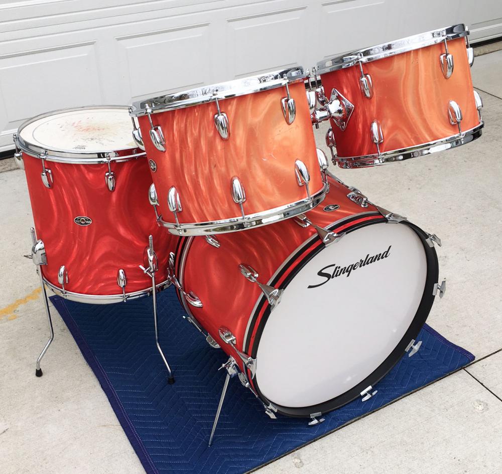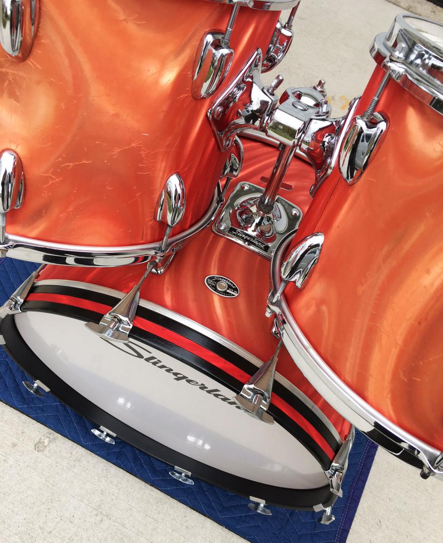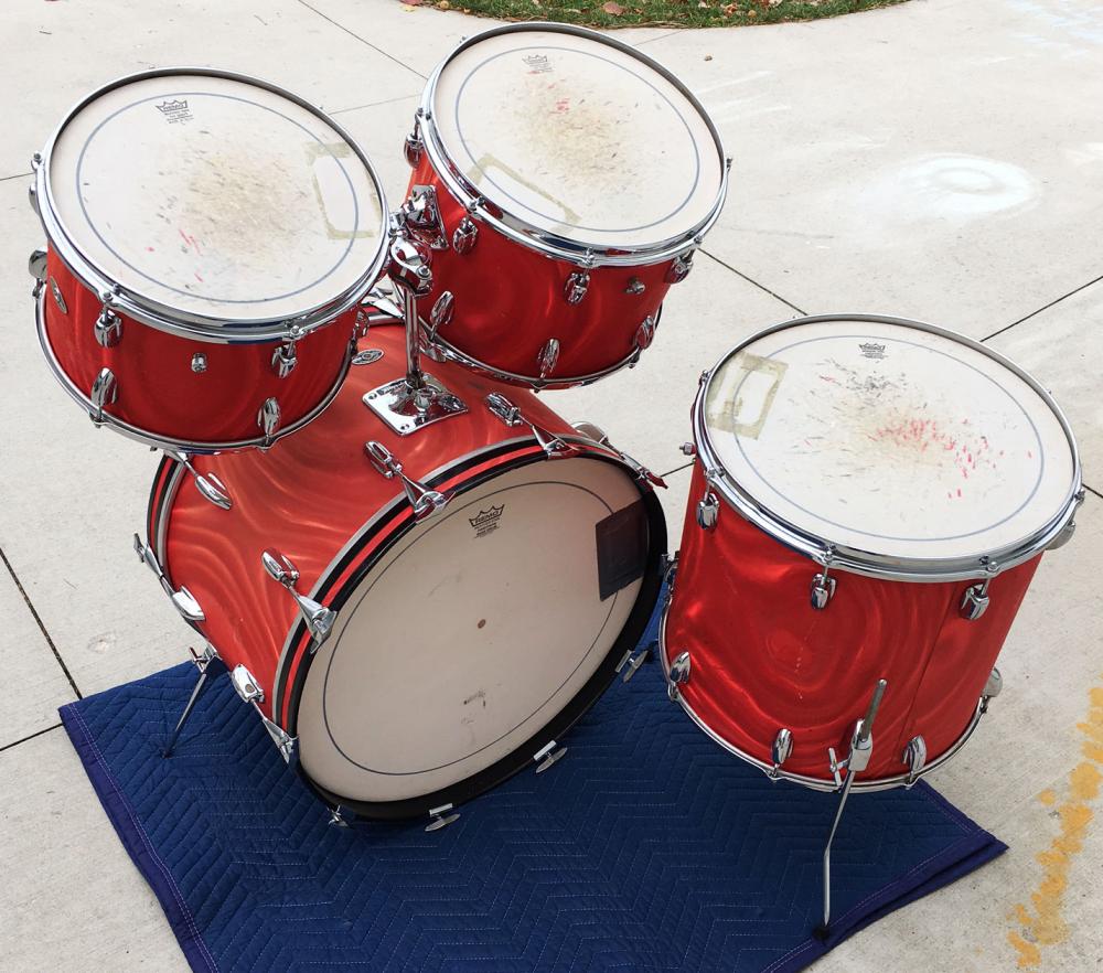 For sale is a nice Vintage 1970s Slingerland Red Satin Flame 13/14/16/22 Set in great players shape. Chrome has minor oxidation and pitting but freshly detailed. Chrome over steel stick saver hoops. Wrap is tight but is heavily faded in areas and has plentiful scuffs and rash. All 3 ply shells are in-round and feature the clear maple interiors. Original bearing edges are in decent shape and tune up well. Could use some new heads. Silver and black Niles badges with the following serials - 13: 133857, 14: 132939, 16: 129985, 22: 128828. Overall a great players kit that will get the job done!