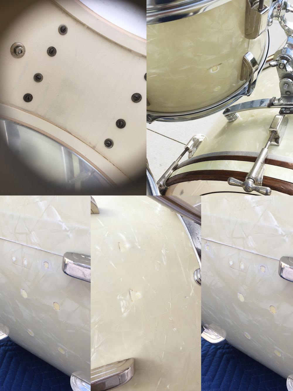 For sale is a beautifully restored Vintage Early 1950s Leedy & Ludwig 13/16/24 with 14 Snare in White Marine Pearl in great players condition. This kit was destined for the land fill but they were rescued and are now back from the dead and sound spectacular! Three ply shells in great condition and all in-round. The 13/16/24 shells have had a lot of work done including all extra/incorrect holes plugged and patched, interiors repainted and all new bearing edges. The WMP wrap is original and tight and was wet sanded a bit to bring it back to life on the 13/16/24 pieces. Matching inlays added to the bass drum hoops which are in good working order but worn. Hoops on the 13 and 16 not original. Hardware is a bit pitted and worn overall. The 14 snare is in great shape and all original besides the non-original strainer and butt which resulted in a couple extra holes that I have left for future conversion back to original if someone so desires. Overall just a beautiful kit that has a new lease on life and is ready to get back to work! Snare stand shown not included.