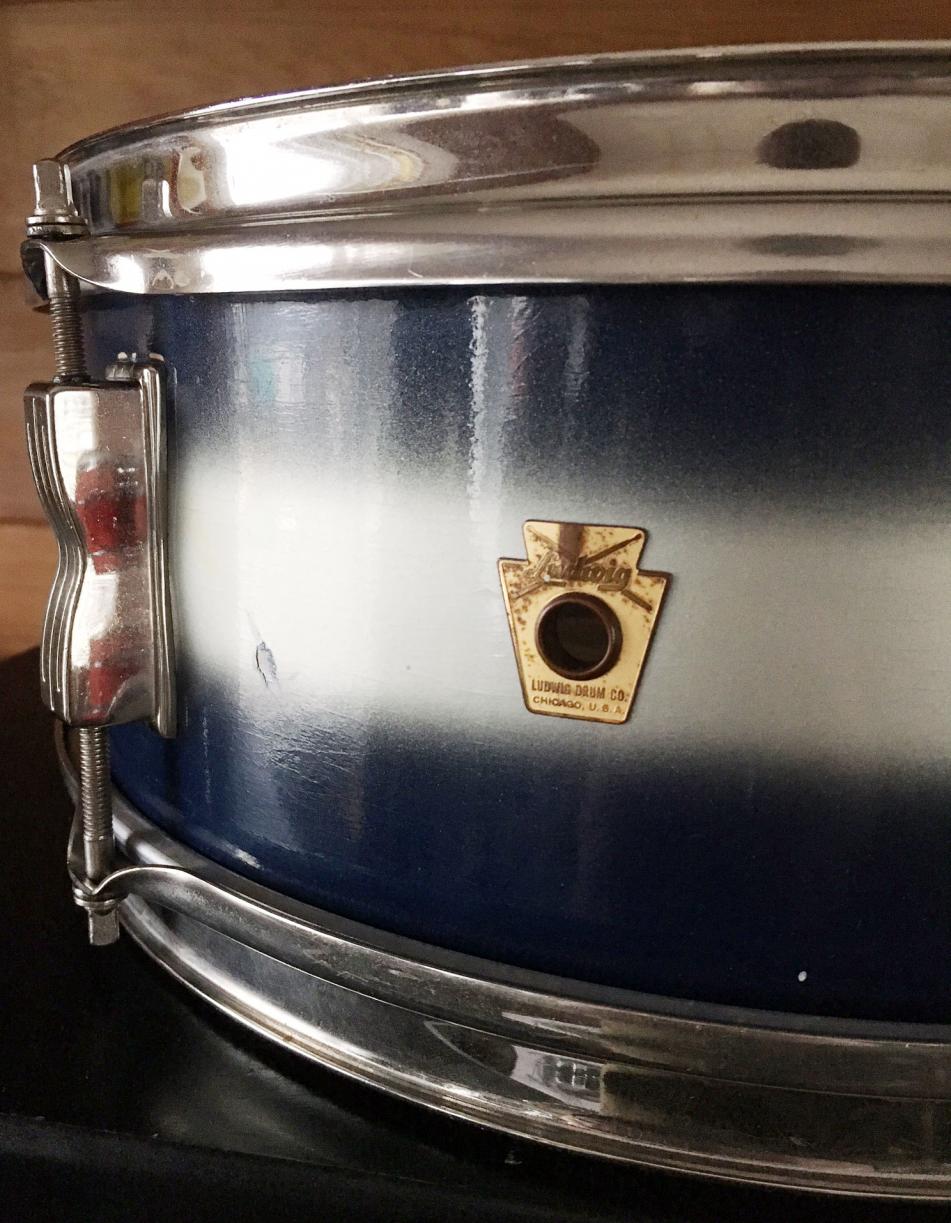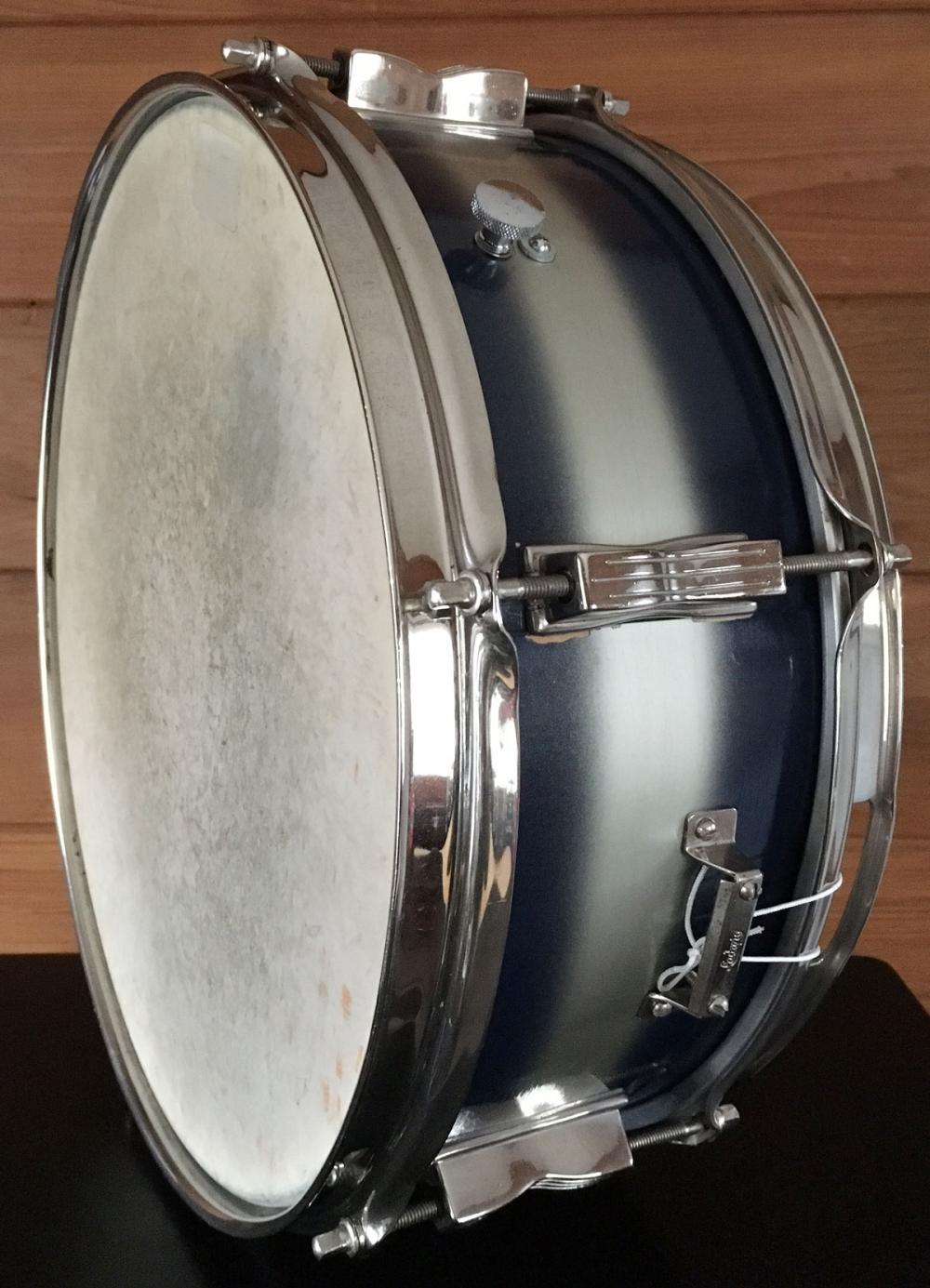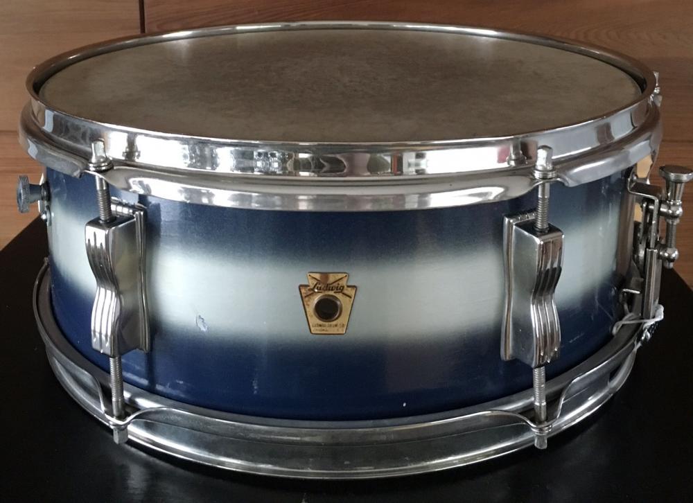 For sale is a nice Vintage Early 1960s Ludwig Pioneer Pre-Serial Snare in Blue/Silver Duco. Shell is in-round with nice original bearing edges. Nickel hardware with nickel over brass hoops. Duco paint has typical spidering and dings here and there. One panel has a name etched into it as seen in photo. Pre-serial keystone badge. Needs new heads. Overall a nice drum!