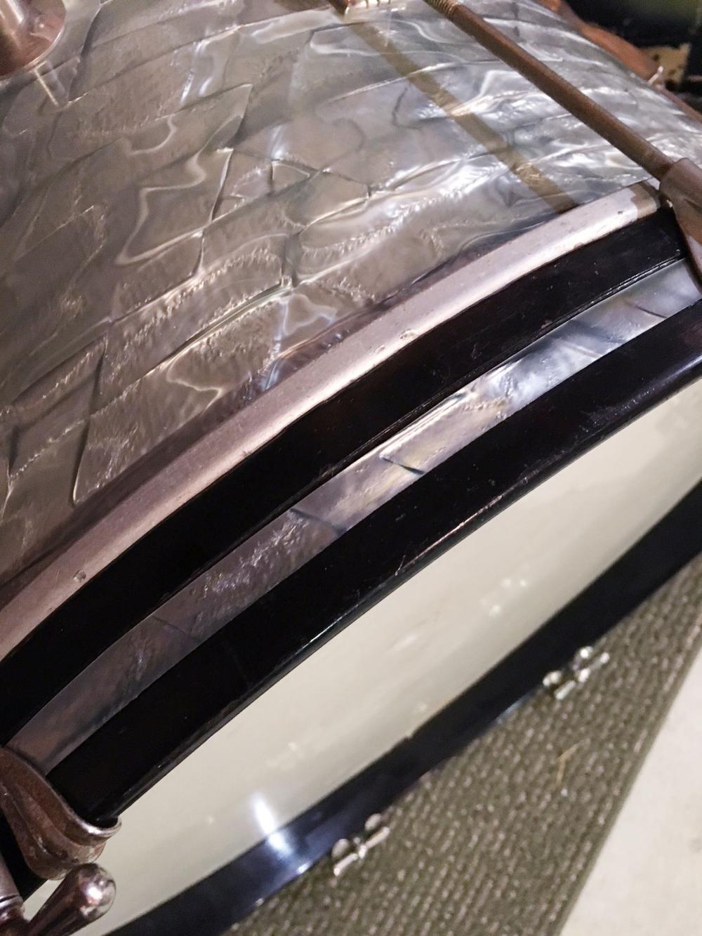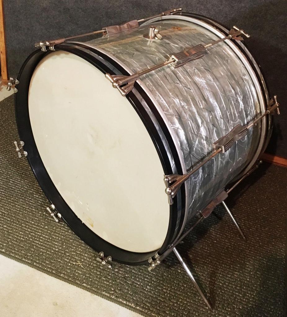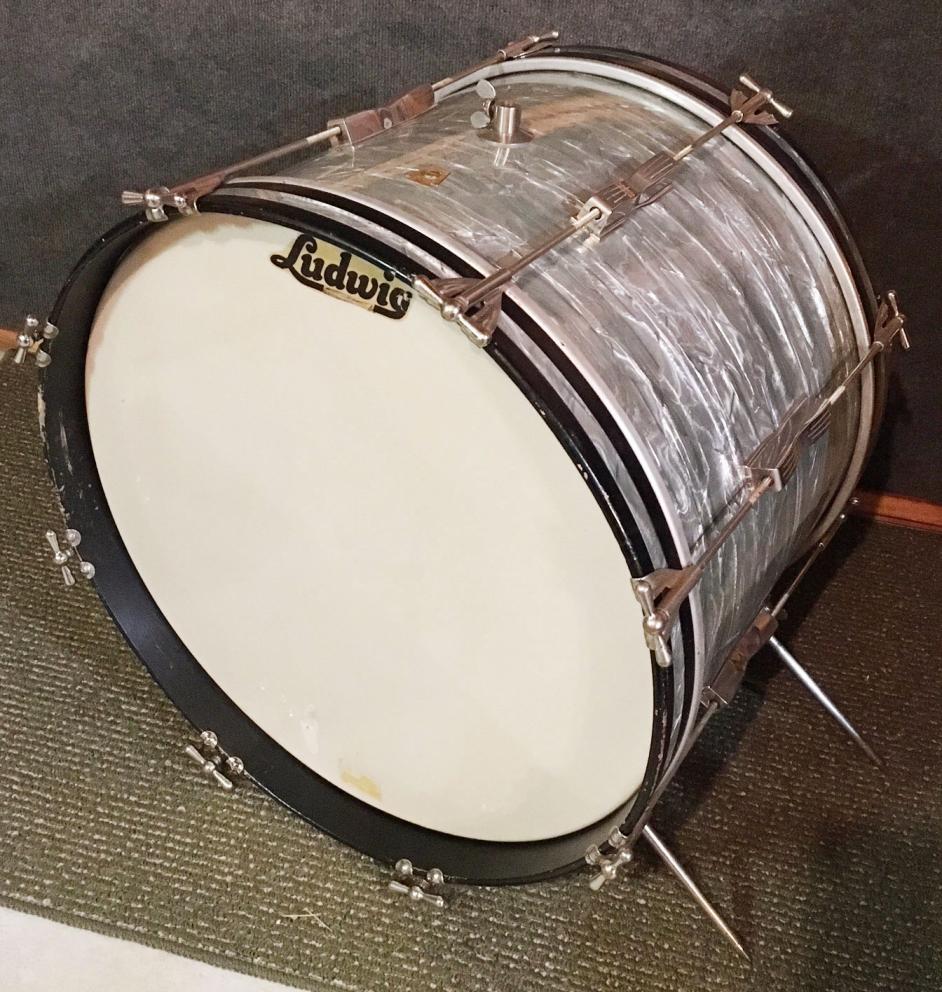 For sale is a Vintage Early 1960s Pre-Serial Ludwig 20" Club Date Bass Drum in Sky Blue Pearl in very nice players shape. Shell is in-round with decent original bearing edges and clear maple interior. No datestamp present. No tom mount holes - only factory drilled for a telescopic cymbal arm. Nickel hardware has some oxidation, pitting and wear. Features four telescoping spurs, not sure if second rear set is factory due to slight hole placement difference. Wrap has minimal fade and is tight and glossy. Seams are nice and tight. One hoop has a large patch of modern Sky Blue Pearl inlay. Pre-serial keystone badge. Overall a great players bass drum!