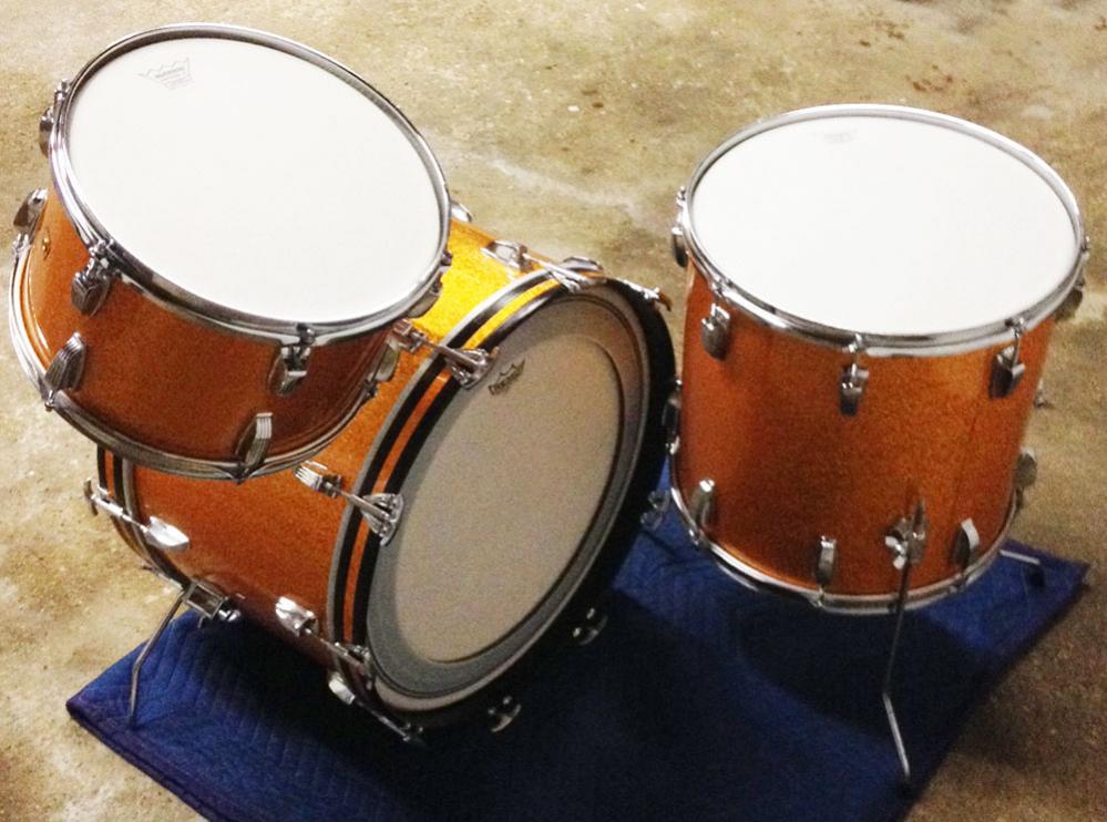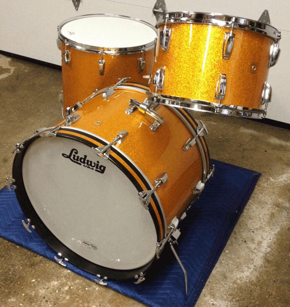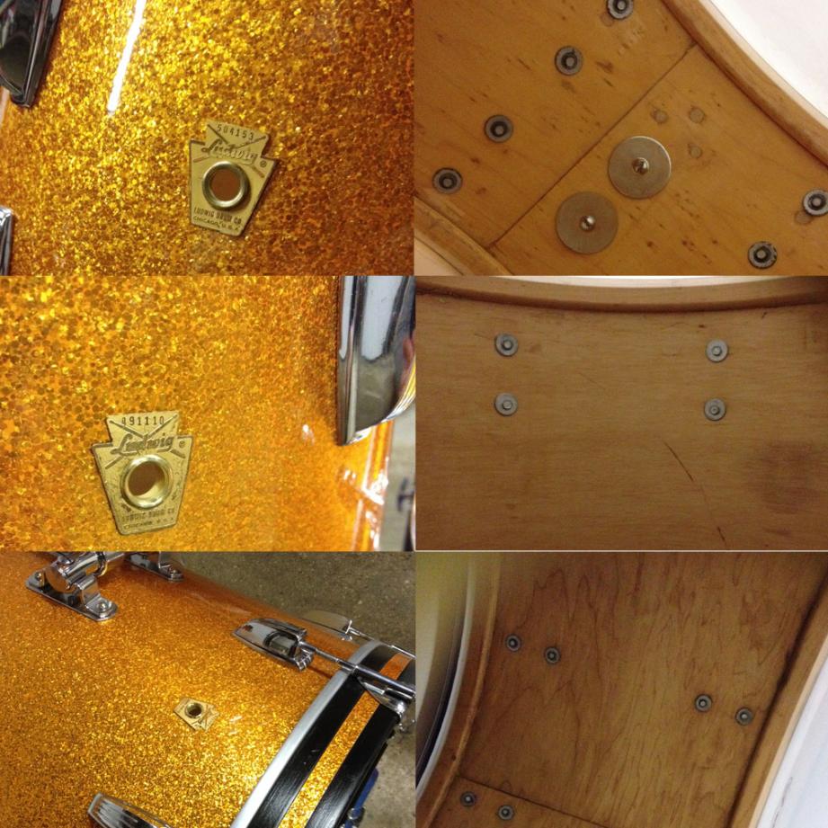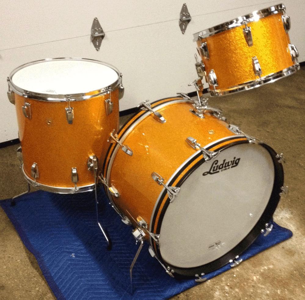 For sale is a Vintage Late 1960s Ludwig Classic 22/16/13 which was rewrapped in Gold Sparkle from Precision Drum Co. Superb players condition. All new coated heads. All shells are 3-ply with clear interiors, in-round and have all new bearing edges. Extra holes from old post mount, spurs, etc. are all filled. Wrap is new, tight and brilliant. Minor oxidation here and there on the chrome hardware. All parts period correct and all restoration work professionally done. Period correct keystone badges with modern replica grommets. If you want a "like-new" players vintage 3-ply kit, this is the one for you!