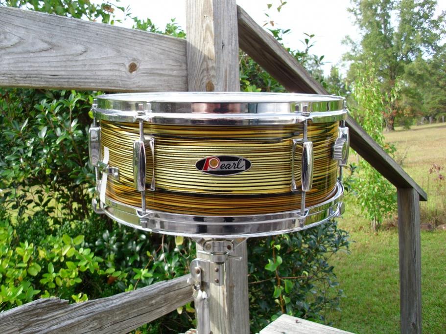 this is a beautiful 1960's Pearl snare drum. I think pearl called this wrap sun set. it is 6 lugs and has a clear interior with re-rings. has a functional round knob muffler. has 20 strand wires and remo heads. the bottom hoop is rounded over at the edges. not sure if its original or not. the snare butt has the cords for the snare wires tied through the two inner holes. may be missing the back piece of the snare butt unless these came like this. otherwise, no issues. it looks and sounds great. the wrap is stunning. this is the way it came to me a few years ago. feel free to pm me here or email to [email]mikelayton@bellsouth.net[/email] if you have any questions. thanks for looking.