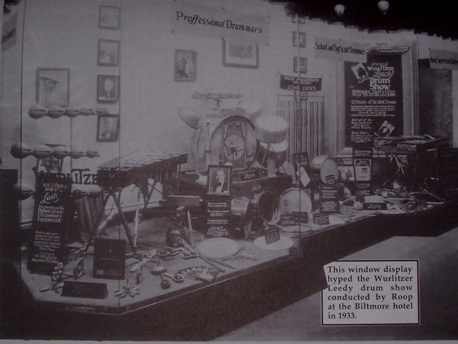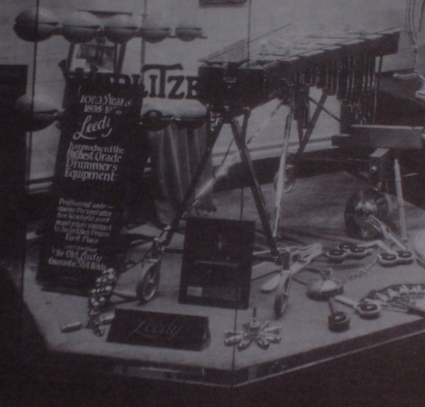 510:My pleasure! I've attached a couple pics of a Leedy window display from 1933 that shows the products they offered at that time. The second pic is a close-up of an area in the display where you'll see some slapsticks. The pic was taken from Rob Cook's publication "The Complete History of the Leedy Drum Company". Make sure to ENLARGE the pics after you pull them up.