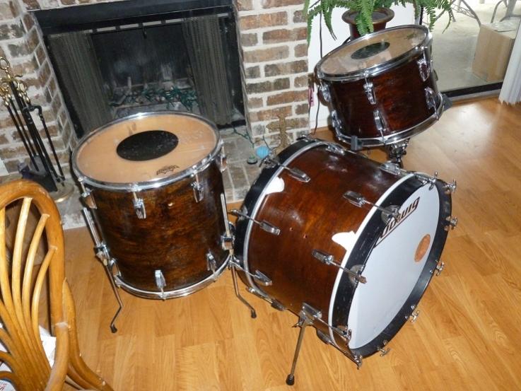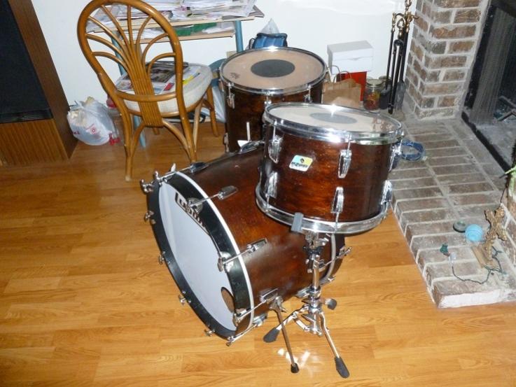 Well, the Ludwig/DW kit I painted in a jelly bean, got refinished in a walnut stain. I found a 16x16 Ludwig floor tom, removed the ugly black wrap and refinished it. It took me three days to remove the hardware, wrap and paint, clean the hardware, stain them and reassemble. It's not a professionally job by no means, but they look pretty good until I can re-wrap them. The rack and kick are 3ply and the floor is 6ply.