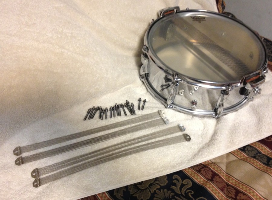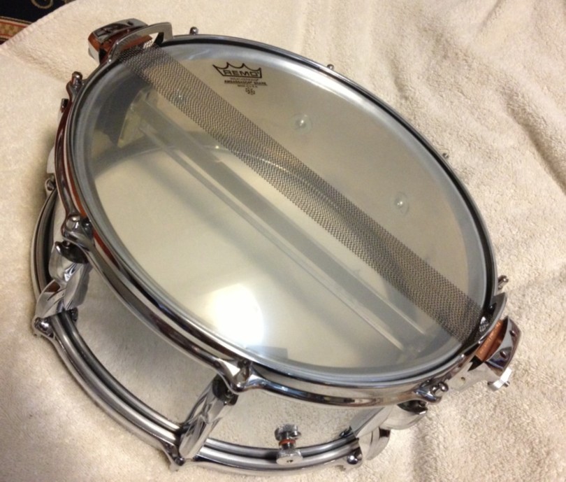 The drum is in very good but not perfect condition. A few small scratches. I am selling with the new puresounds wires shown on the drum but also including the original 2-12 strand snare set that came with the drum and a 2nd 2-12 strand snare set. The drum has the original slotted head rods but I am also including the standard head tight screw tension rods I had bought for the snare. I do not have a slotted key. the original broke.