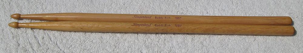 Chances are... the Slingerland BR sticks you have are going to be 70's era, and I'll be able to tell once I see them. There were THREE models, only one of which Buddy actually played. Those are the wood tip with red lettering, and most all I have seen are 70's era. There is also the Buddy Rich OAK model, and those have blue lettering, otherwise same profile as the hickory model with red lettering. Buddy never actually played the OAK model stick that I have ever seen, but they are nice to have in a collection despite that. I do have an NOS/NIB pair of the BR OAK as well. There was also both a GK and BR "N" model offered by Slingerland, which was a nylon tip. Again, Buddy never played those as he preferred a wood tip. Can't say for Gene though as I haven't researched him to this degree. Nice to have an NOS pair though! Here are a couple pics of both Slingerland BR models from my collection. ENJOY!!