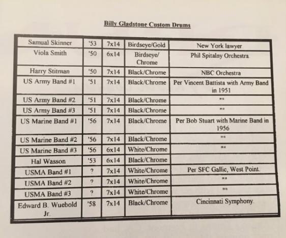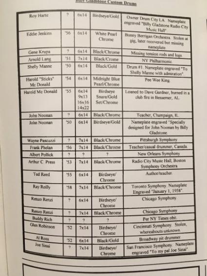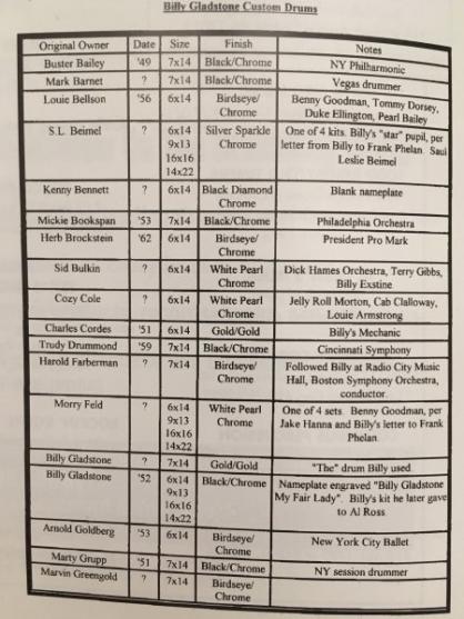 With the recent posts from Steve Maxwell about the Gladstone complete set I have been wondering about the snare drums. Somewhere I had seen a listing of all the snares Billy Gladstone made under his own name (pre Gretsch). It was a document somewhere on the internet. I remember it listed those that were lost or destroyed, the ones owned by The Marine band (some of which were stolen) and those made for famous drummers including Shelly Manne. Does anyone know where this list is located? I’d like to view it and save a copy.