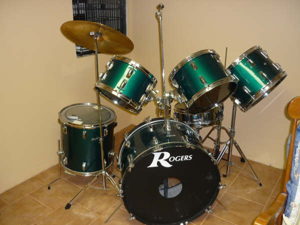 I'm looking at a Rogers kit and thinking there might be something wrong. It's a Fullerton as far as I can tell in a green sparkle or maybe just a regular green wrap(did they make that?) Anyways it's 24/12/14/15/16 with a powertone and hardware and several Zildjians(ZHT) and 2-3 real Zildjians(hopefully signed by some guy in Turkey!) From the photos they have the script logo and the speckled grey interior but the modern Memriloc hardware. No big "R" anywhere on this kit all script logos. The finish I've never seen before and it does not look like a re wrap. With the interiors I'm thinking Fullertons. Did any drums ever come with the script logo and the updated mounts-early memriloc?? It's going for about 600. No extra holes either as far as I can tell. I haven't got my paws on them yet but even still a good score?