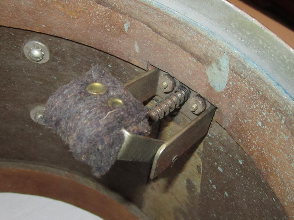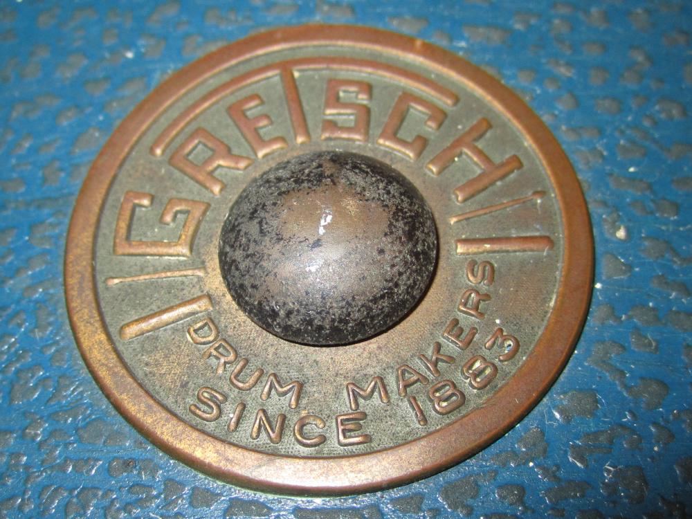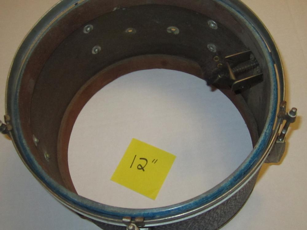 12 inch tack bottom tom-tom drum. Mark Cooper tells me this is a lower end line tom from the late 30s-early 40s. These parts are missing: bottom skin, tom mount and it appears it has been painted or the paint is peeling. There was no batter head on the drum when it came into my possession. On the positive side, the hoop, lugs, collar tension screws, and internal muffler all seem to be original. Was also glad to see the original bottom tacks and Gretsch round badge and pin were all intact. Having no experience with drums of this vintage, I’m not sure what to make of the shell covering/ paint and if the hardware has been painted.