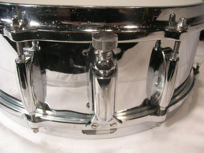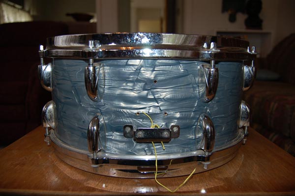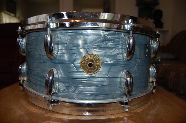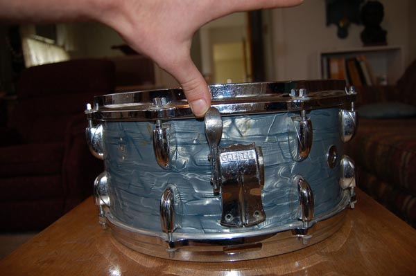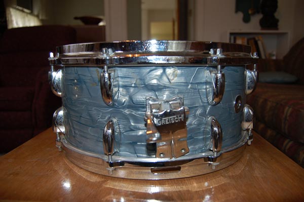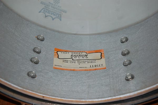 A couple of questions... I just picked up an old RB Gretsch for a STEAL. (I almost feel guilty revealing what I paid.) It's a 6 or 6.5 x 14 six ply with the "silver sealer" paint and Midnight Blue wrap. The strainer butt is unoriginal and it looks like there have maybe been two on before. (at different times) It has a lightning strainer and I can see no extra holes on that side, but I didn't think they made the lightning strainer during the RB days... I think it is a Broadkaster Floor Show, since it has the 16 seperate lugs. I think two of the "butt-holes" (: would match the butt in the picture of a later drum (not mine) that I've attached... the other four holes are in a rectangle like a microsensitive (right?) I'll get pictures during my lunch break. At the same place I also picked up a black/silver Niles badged Slingie 3 line brass shell 5x14, as well as a 70s 402 super-sensitive, converted to a p-85, so I'll be posting some want ads in the correct section.
