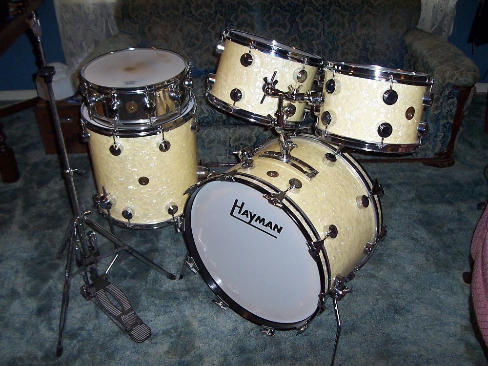 Late 60's-early 70's Hayman 5-pc rewrapped in WMP. Sizes are 8x12, 9x13, 16x16, 14x22 & 5.5x14 (snare re-wrapped in chrome). Cases included for all except snare.