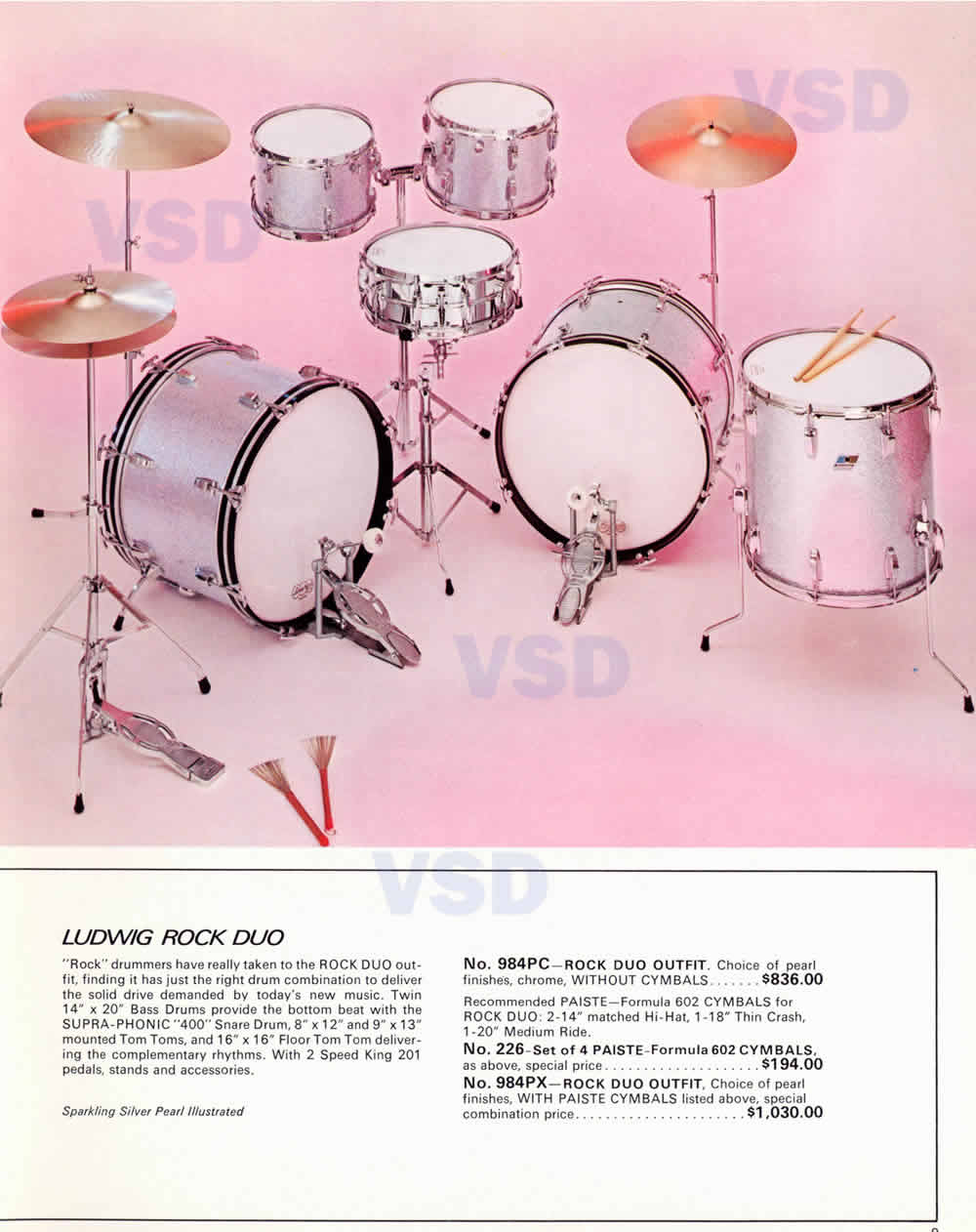 hi,my name is doug and i'm sure glad i found this site! as a teen my dad bought me a 1971 Ludwig black oyster double bass kit (similar to ginger baker's) with the double mounted tom stand. the bass drum sizes were 22" and 24" with 1 floor tom and internal mufflers(which i loved!) it had the blue/olive badge. i'm sure i saw it in the 1971 catalog. i remember it sounded great but at age 20 (4 yrs. after i bought it due to economic reasons i sold it.) my questions are: what did it originally sell for with just the high hat and cymbal stands and 2 speed king pedals-minus cymbals. what would it sell for today if any are available? what was the model of this ludwig kit? what model of chrome snare came with this kit? what other history is known and was this a good selling kit and what were the overall reviews? i have pictures of the kit on my computer but i don't know how to post it! i'm sorry i don't have any serial numbers or anything. any info would be apprciated. thanks!