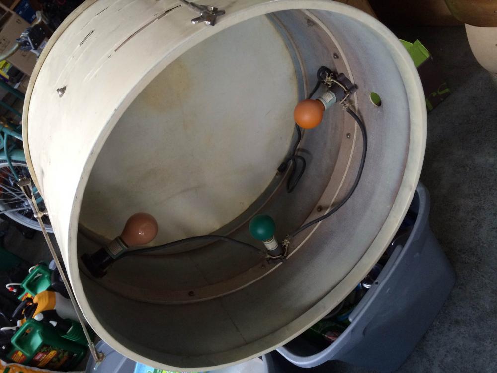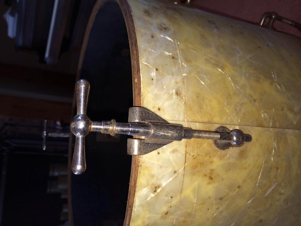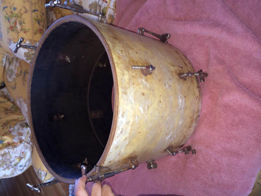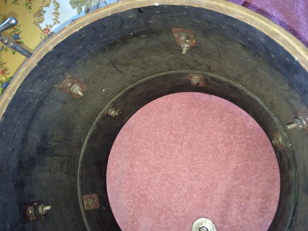 Ok, finally uploading some pics of the mystery drum for your opinions and one of the George B Stone bass with lights. Will share more pics of the other finds (including Ludwig Pioneer basses in walnut, a couple Slingerland marching snares,2 Slingy Bass drums '53-56 era Black and Duco blue/silver both nickel hardware )