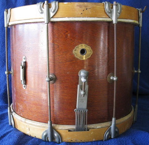 I recently purchased an old Slingerland Snare Drum from Goodwill of all places. It has a 1928 - 1941 Cloud Badge and a Slingerland Strainer that I cannot identify. It looks like someone took off the sparkle finish and painted it a brown/maroon, but I can still see left over gold sparkle where the strainer is located. It also has wood rims that have been painted gold and one WFL calf skin head that is in rough shape. It has a 14 in. rim and is 10 in. deep and looks like a ply shell. It came with 6 clamshell rods, but I am not sure if this is the original number or if it is missing a few? It is missing a piece next to the strainer, but I am unsure of what this might be, a damper? Any help identifying the drum and also advice on refurbishing would be appreciated. I would like to bring it back to as original, playable condition as possible. I have included some pictures below, thanks in advance for your help.