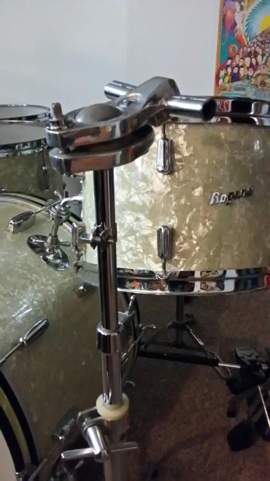 The earlier Slingerland mount I was thinking of had a rectangular plate rather than a diamond shaped one so I bet that is one from a Ludwig Standard. A set-o-matic tom bracket should fit those same holes and could work as a base plate for a SOM arm. It wouldn't be quite "correct" but would be closer than what's there now. The regular SOM base wouldn't work because the holes aren't lined up right for it but the tom plates do go on positioned as a diamond shape and the tom arms and the upright tube are the same size.