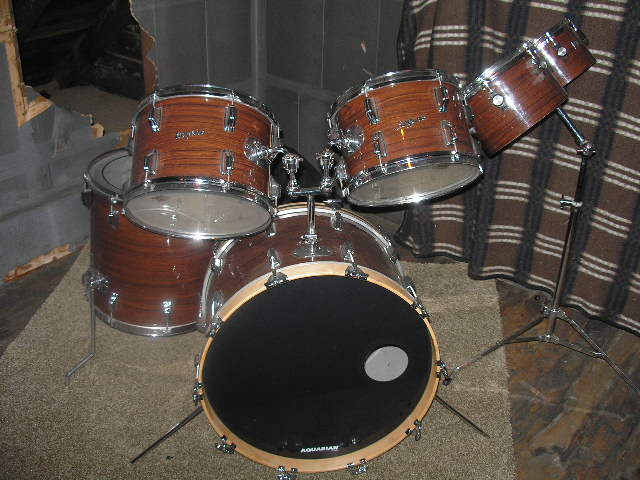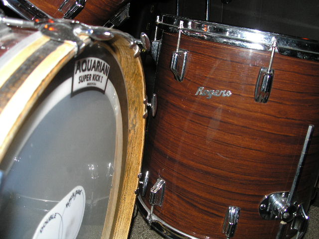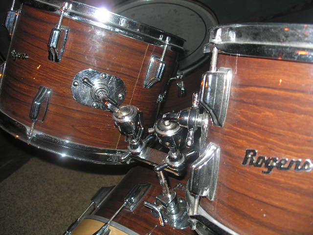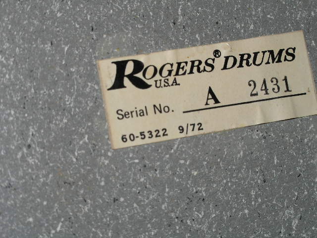 Your kit is a Rogers "Londoner V", and the wrap is KOA. These are Fullerton, CA built Rogers, but being that they are late 1972/73 models, the drums still have the Swivo-Matic hardware, Knobby's, etc. By this time the hardware/mounts are all CAST as opposed to MACHINED, thus they are much more prone to cracking under stress/use... but they were "cheaper" to manufacture, thus insuring the bean counter's at CBS's bottom line... but I digress. So,