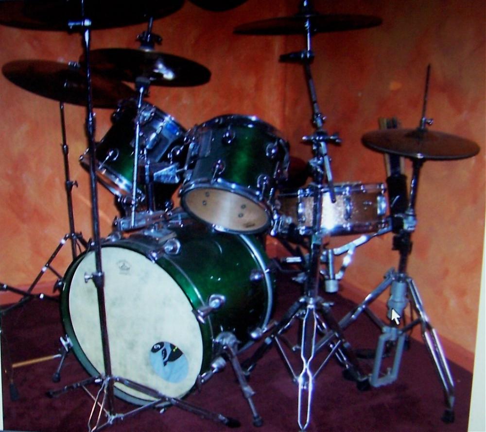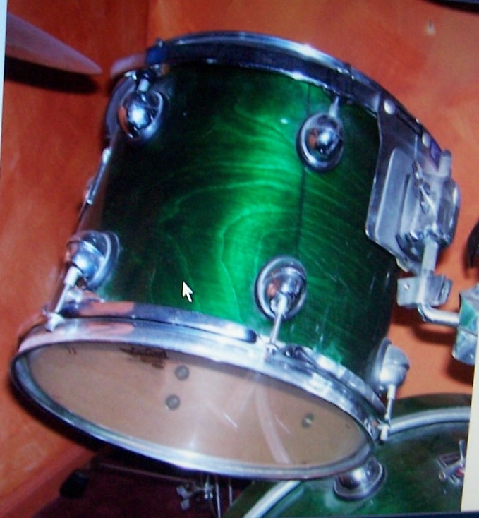 The remaining kit is a Premier in what I believe to be Green Silk. I might be mistaken since I know next to nothing about non-American drums. I'm hoping some of you might be kind enough to "enlighten me" about this particular kit. I have no idea whether it's actually a vintage Premier kit or something newer. Unfortunately, since I haven't had the time to stop by her home as of yet I've got no idea of the respective sizes of the drums.