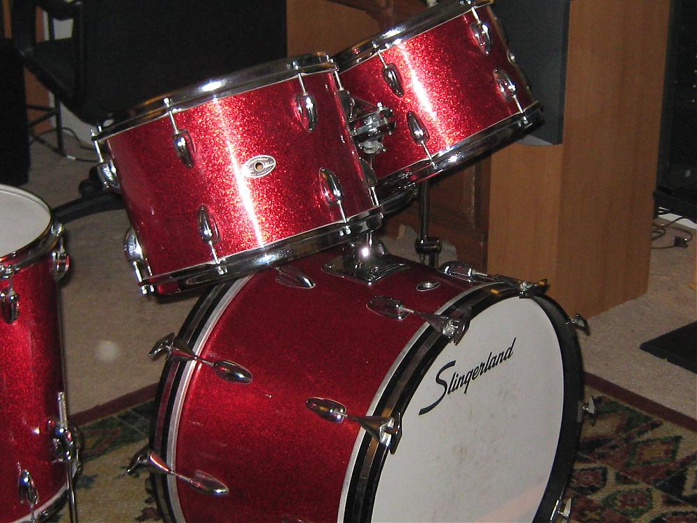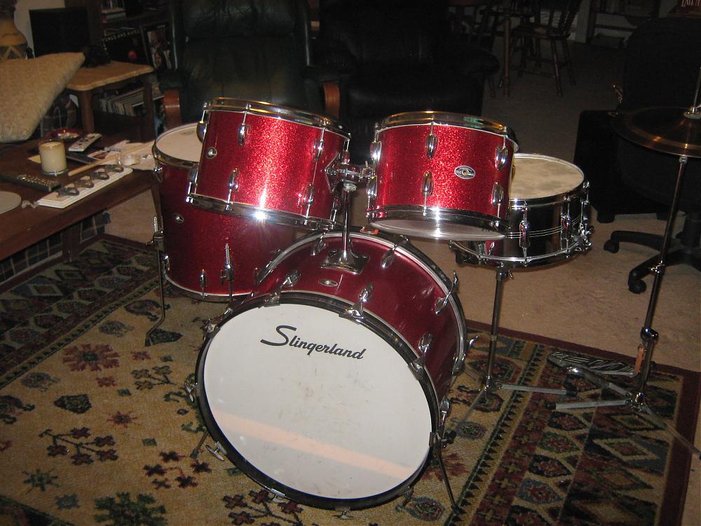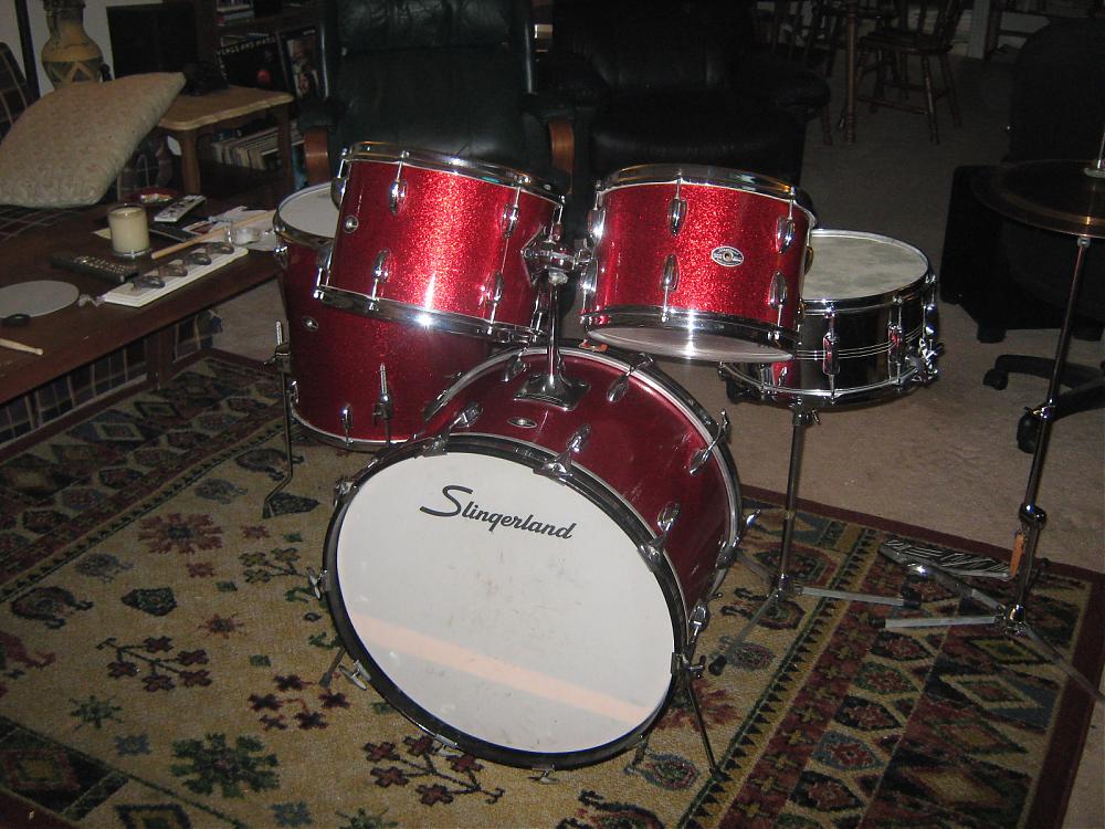 Finally got it somewhat together. 1977 Slingerland Modern Solo Outfit. Factory issue, except the '65ish Gene Krupa Sound King Snare. Foot pedal, and hi hat stand came with the set.... the snare stand is an era-correct replacement. I have two heavy-duty Slingy cymbal stands (not the flat based that comes with this set-up) that are era-correct, but in need of a good polishing.
