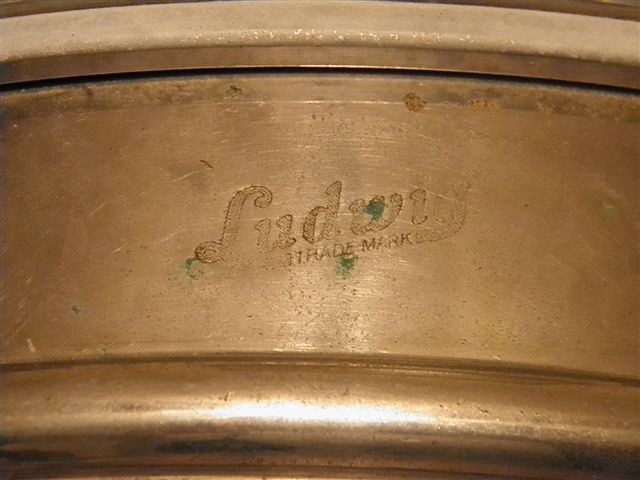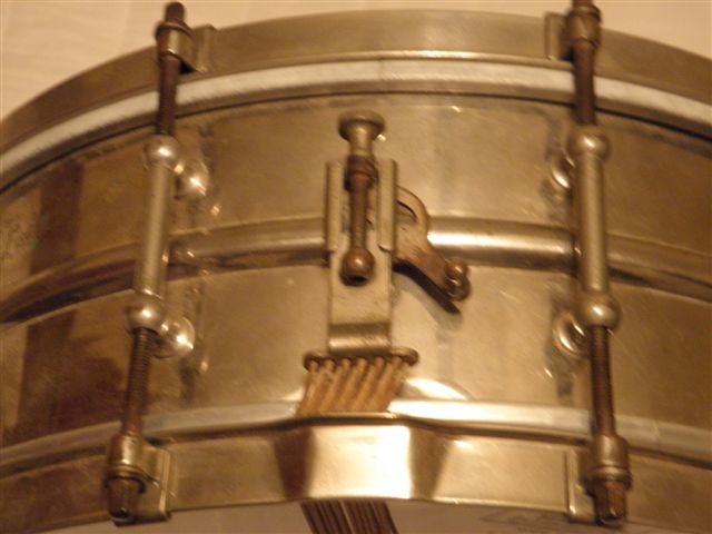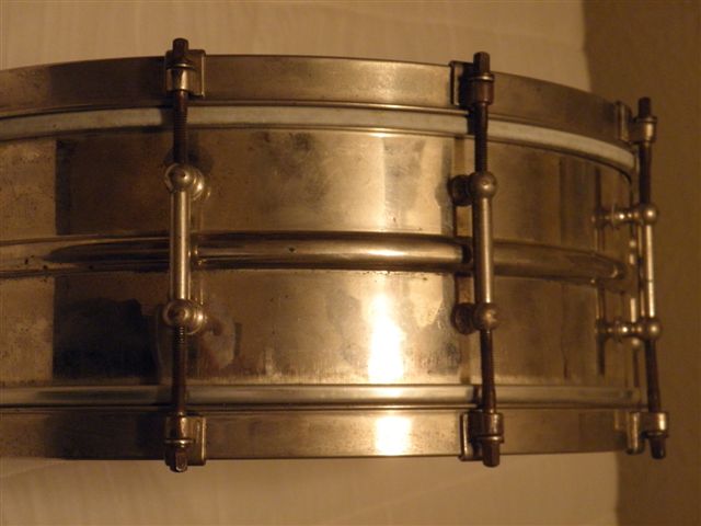 Thanks for the quick reply. That sure looks like what I have. I think mine my be the "all around" model, though, since it is not 15", but only 14". Have you got any idea of the shell material? The brochure only says "all metal."Thanks again. I did a bit of poking around earlier today and I wondered if the drum might be from the 20's or 30's. But I didn't want to speculate without having someone look at it who would know for sure. If I clean it up will it diminish the value and is it possible to use modern snares on it without damaging the strainer?