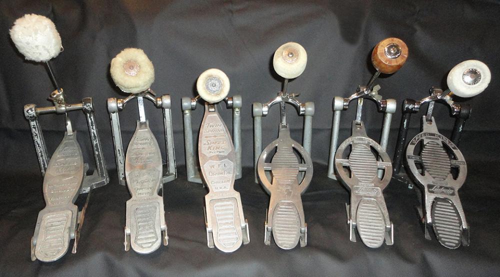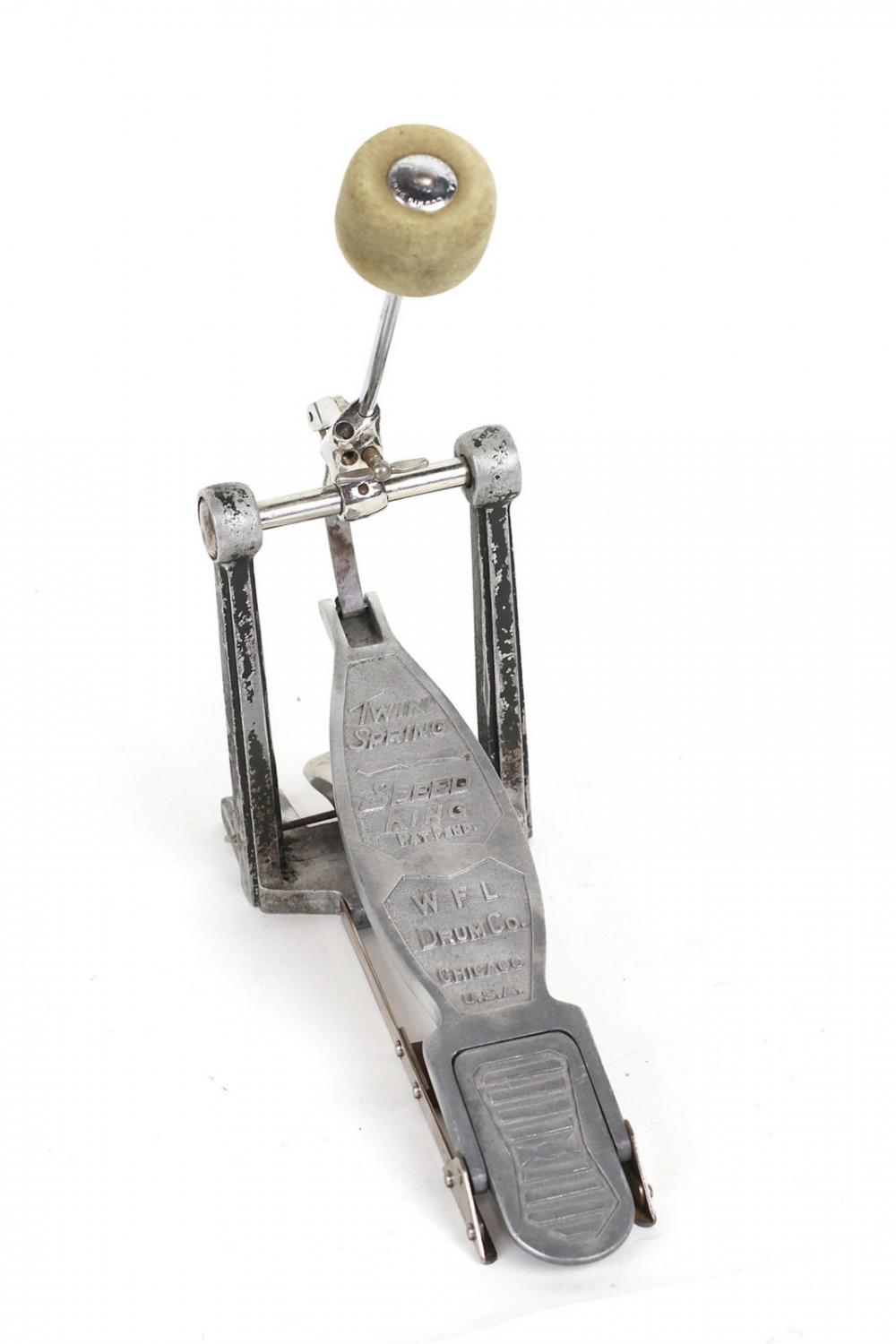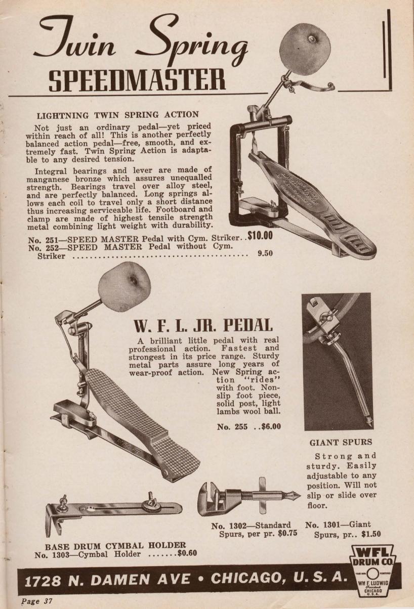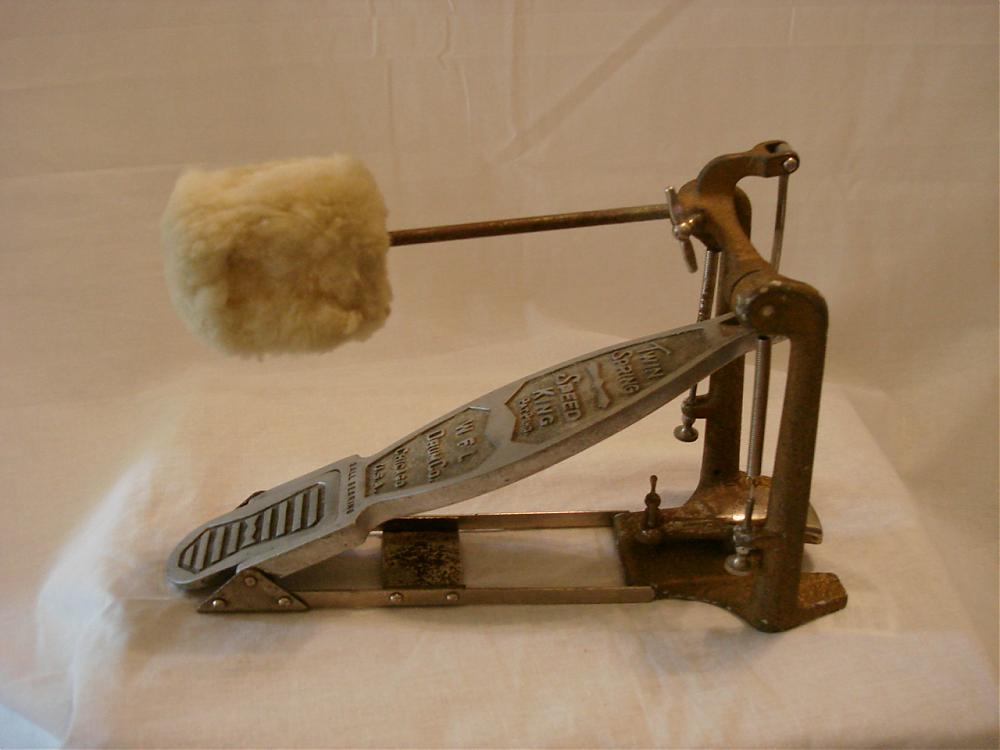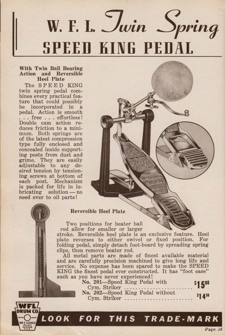 Hey ScottHere's a photo of what I believe to be one of the first Speed King pedals which I've just recently bought (haven't quite got it yet). It was advertised as 1936 (maybe a prototype?) William F. Ludwig started his company properly the next year if I remember right and patented the design for the internal twin springs inside the posts. On my earlier version they are still outside - the later design obviously worked better! On the upper section of the footboard it says 'Twin Spring - Speed King - pat pend' . The original paint on this one is gold coloured.I use a couple of the later 50's Speed King pedals - great design!Dan