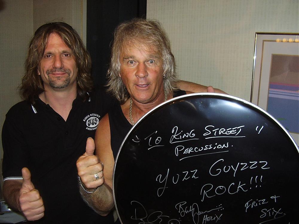 Growing up listening to helix and getting to see them live back in the day was a big thing for me in so many way's , The first show i seen back in the 80's planted the seeds in my head on becoming a drum tech much later in life. On the 24th of march 2012 when my small drum shop got a call from one of the roadies from helix asking if we could come down and make some repaires to fritz kit , let me tell you it did not take us long to get down there and get done what needed to be done. I must say the whole group was super nice to us and took the time to hang with us and share some stories , and the best thing we walked away as new friends.