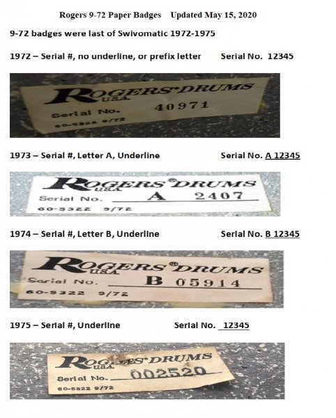 Hi, I after too many years bought my 1st Rogers kit, a 1972(?) Script logo 8 piece New England White: 2x 14x24, Toms 8x12,9x13,10x14,Floor toms 16x16,18x16 with Superten COB(?) 5x14snare. All drums except the 10x14 have labels and all do have grey speckled interior. They carry the same designation: 60 5322 9/72. The serials are: Bass A6267, 18” 80523, 16” 9108, 14” u/k, 13” A8341, 12”A2158, Snare 4012. All labels are borderless. To add a little width I bought in a 8x10 Concert tom allegedly BigR. On stripping it I found it to be what I believe is a Script tom, speckled interior numbered as above and serial 59958. The original 8 piece was sold to me and imported by me into the UK as “1972 studio use only kit”. My limited researches lead me to believe this is a Fullerton kit but the numbers of course are a mystery to me. So I ask please for some clarification from anyone thanking you in advance.